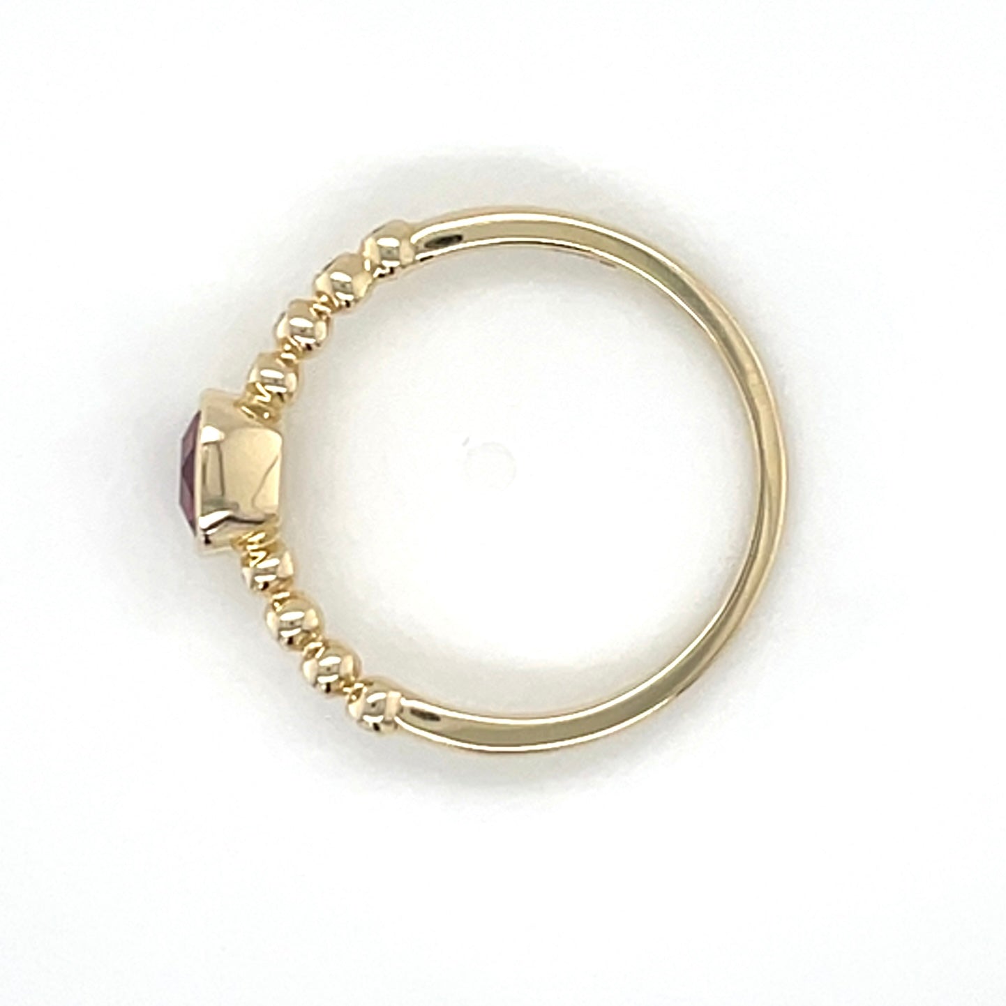 Expertly crafted from 9ct yellow gold, this stunning ring features a dazzling cushion cut rhodolite garnet as its centerpiece. Complemented by sparkling diamond side stones, this elegant piece is sure to add a touch of sophistication to any outfit. Perfect for those who appreciate timeless beauty and quality.