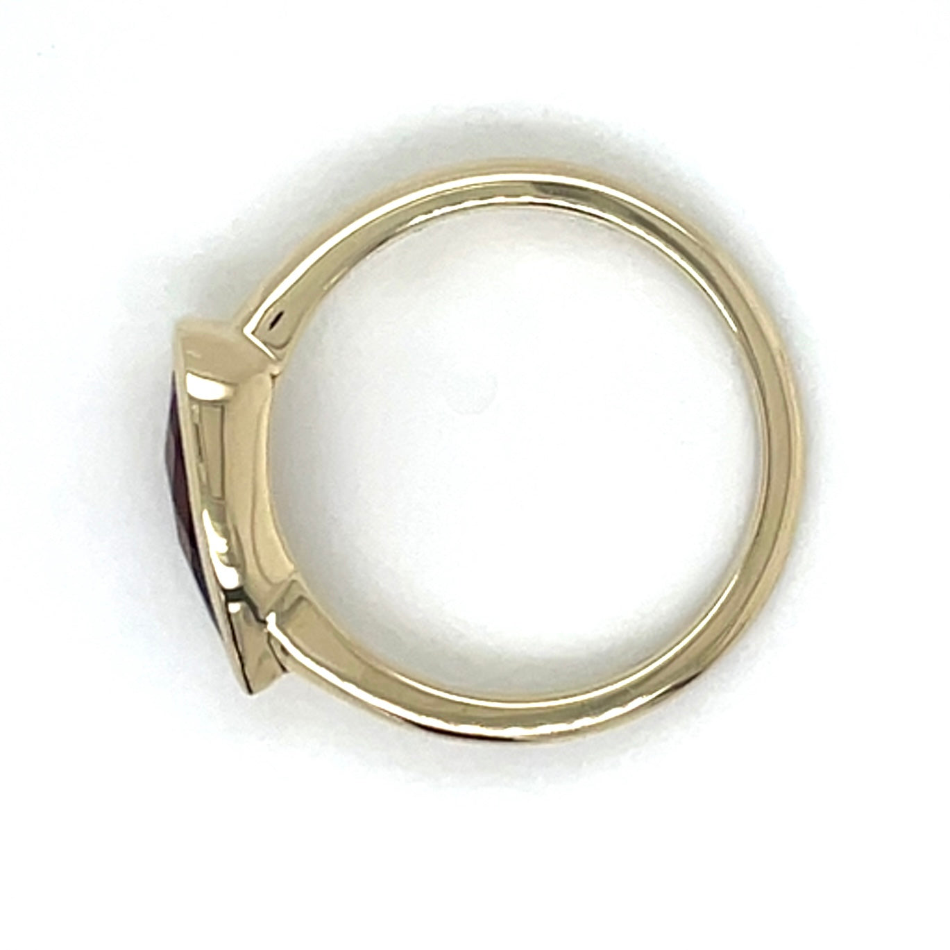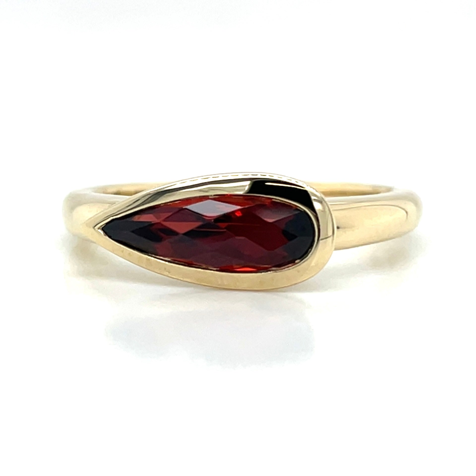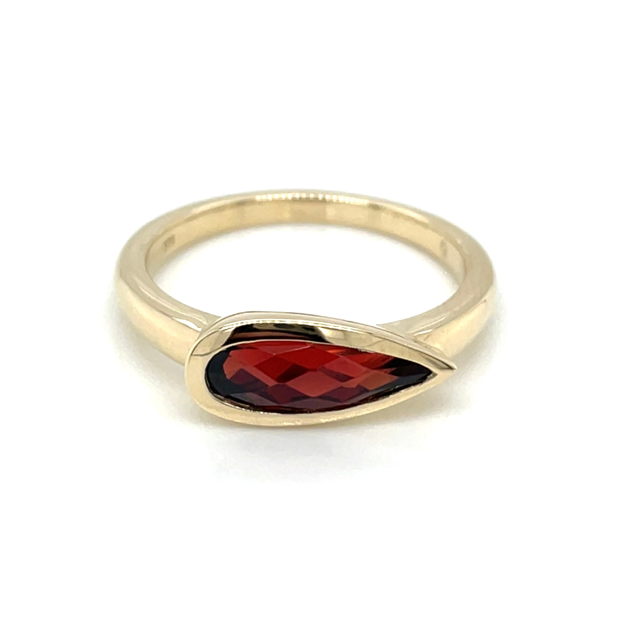 Expertly crafted with 9ct yellow gold, this stunning ring features a pear cut garnet that radiates deep red hues. Guaranteed to add a touch of elegance and sophistication to any outfit. Perfect for those with a refined taste in jewellery.