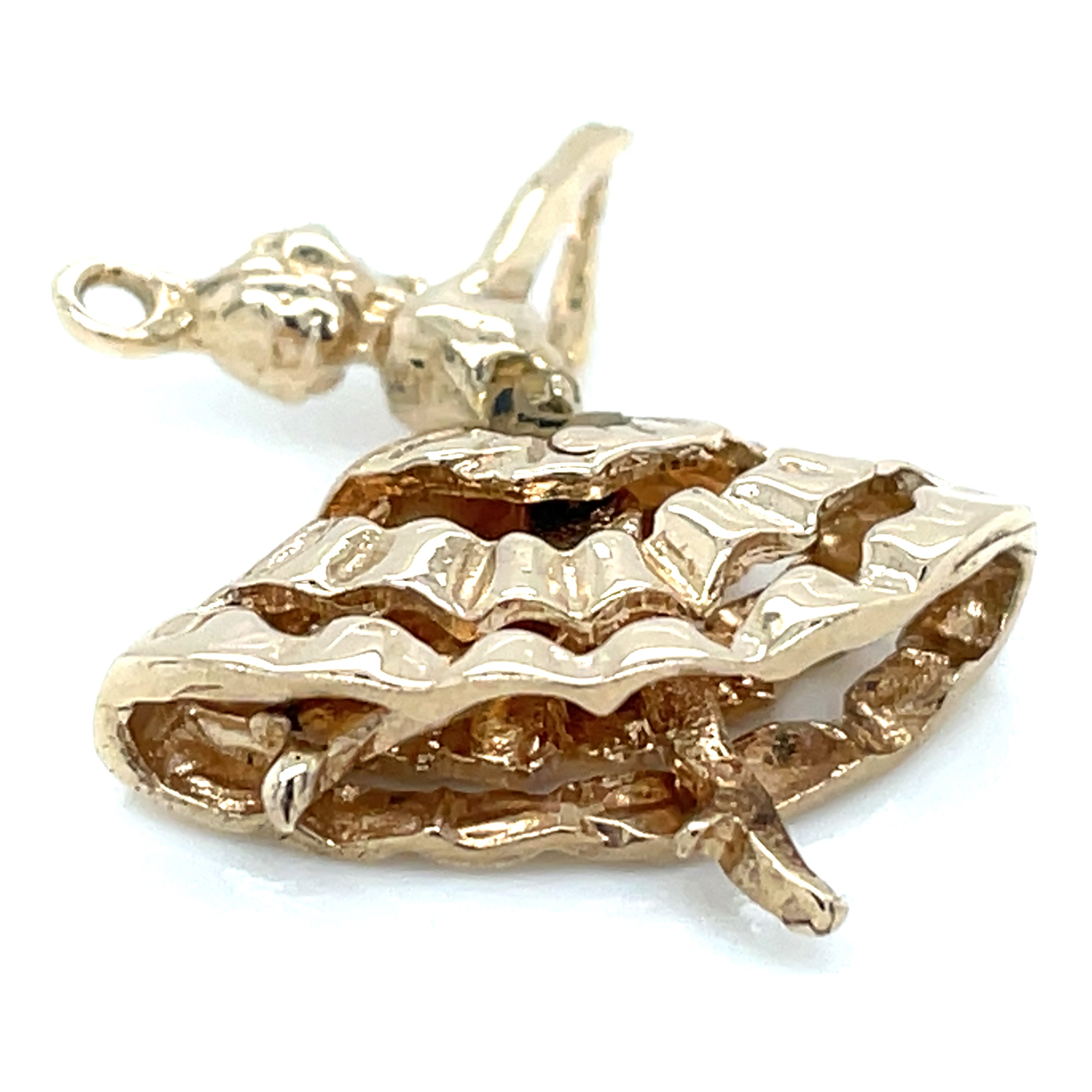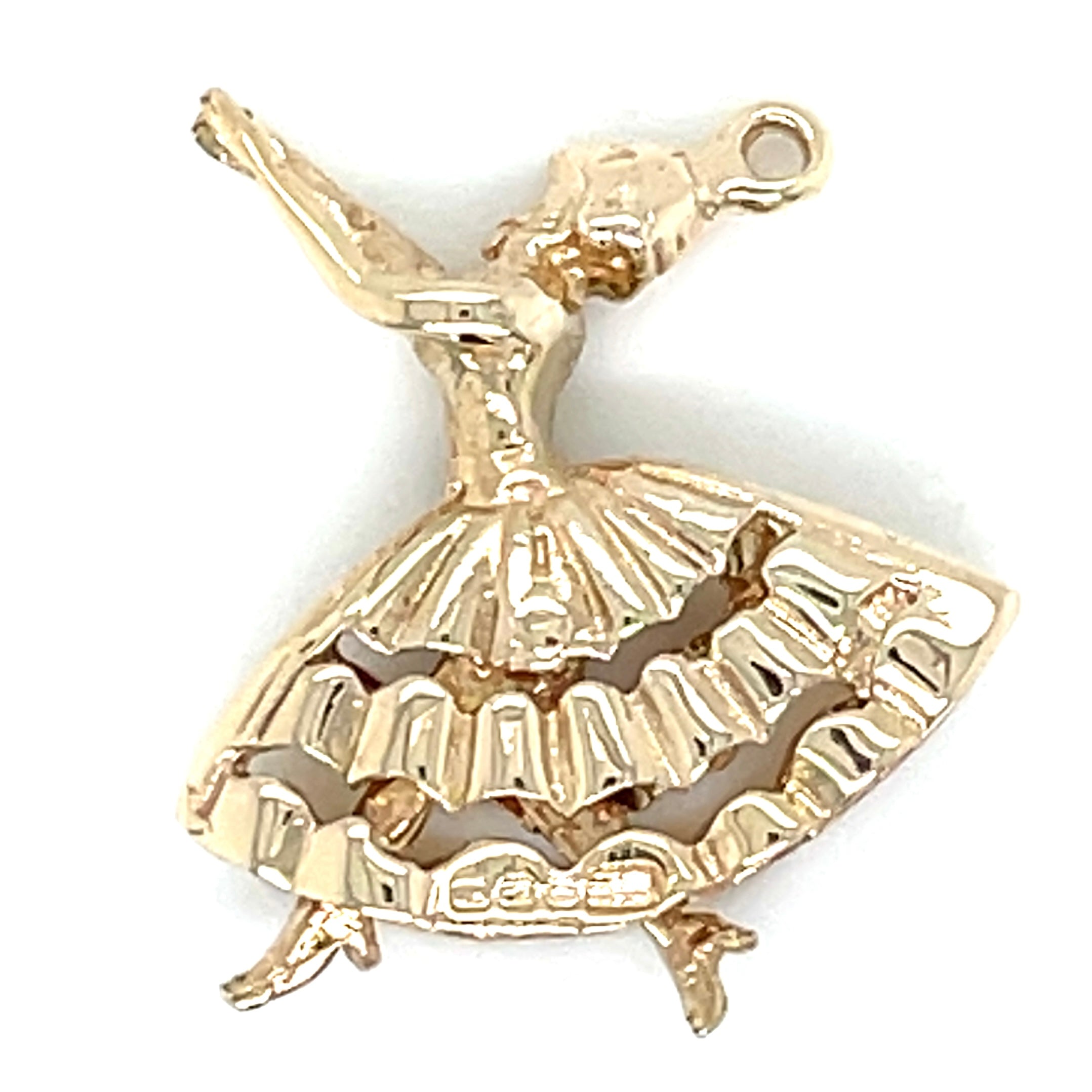 Crafted from 9ct yellow gold, this vintage dancer pendant adds a touch of elegance and sophistication to any outfit. Perfect for both casual and formal occasions, it showcases the beauty of gold in a delicate and unique design. A timeless piece for any jewellery collection. Length of 2cm, width 0f 1.8cm