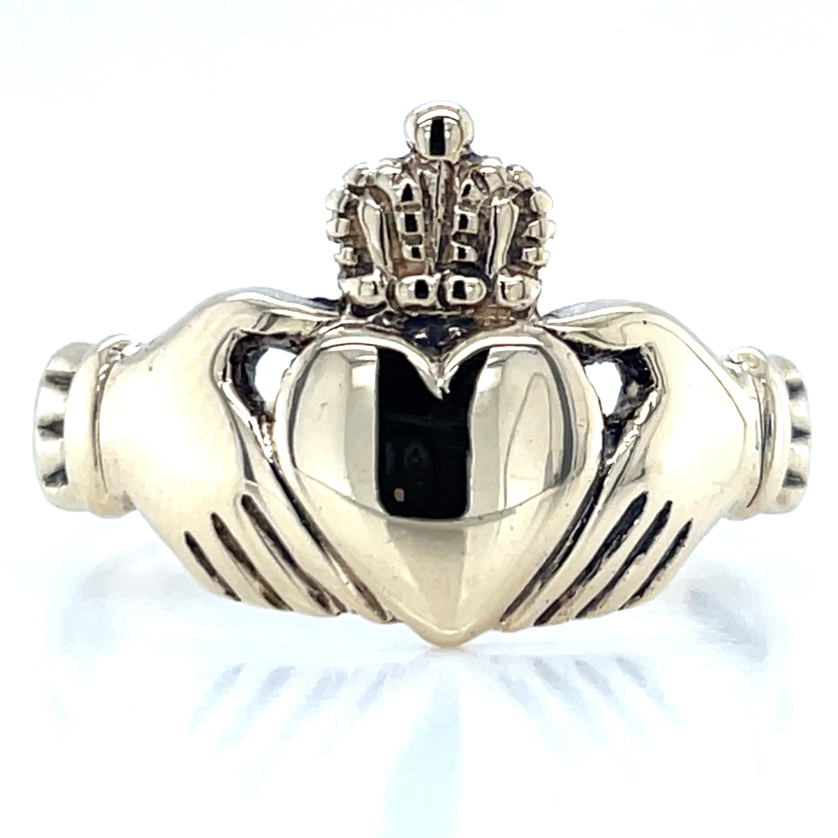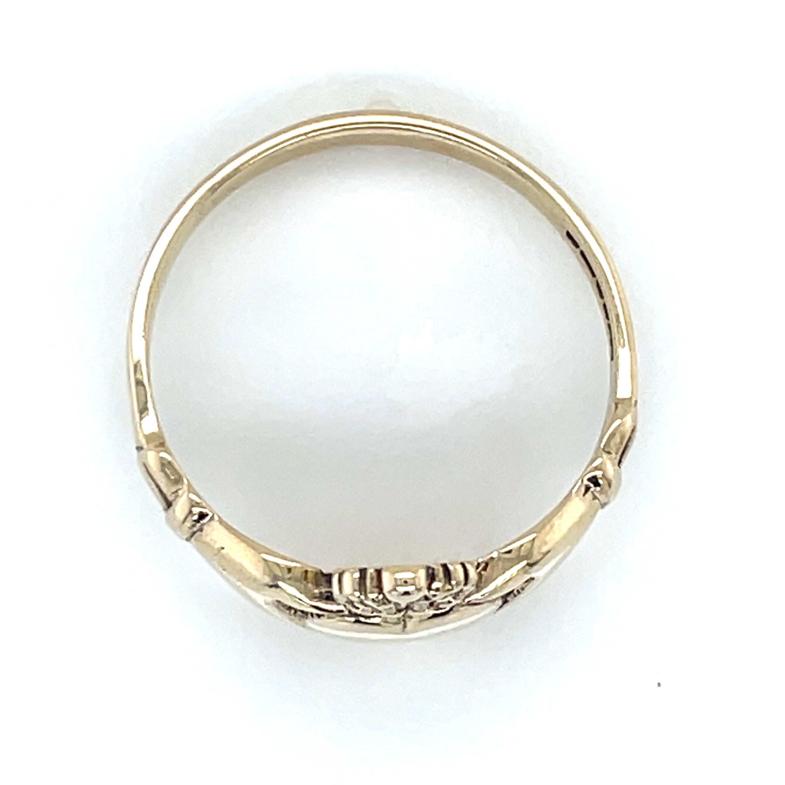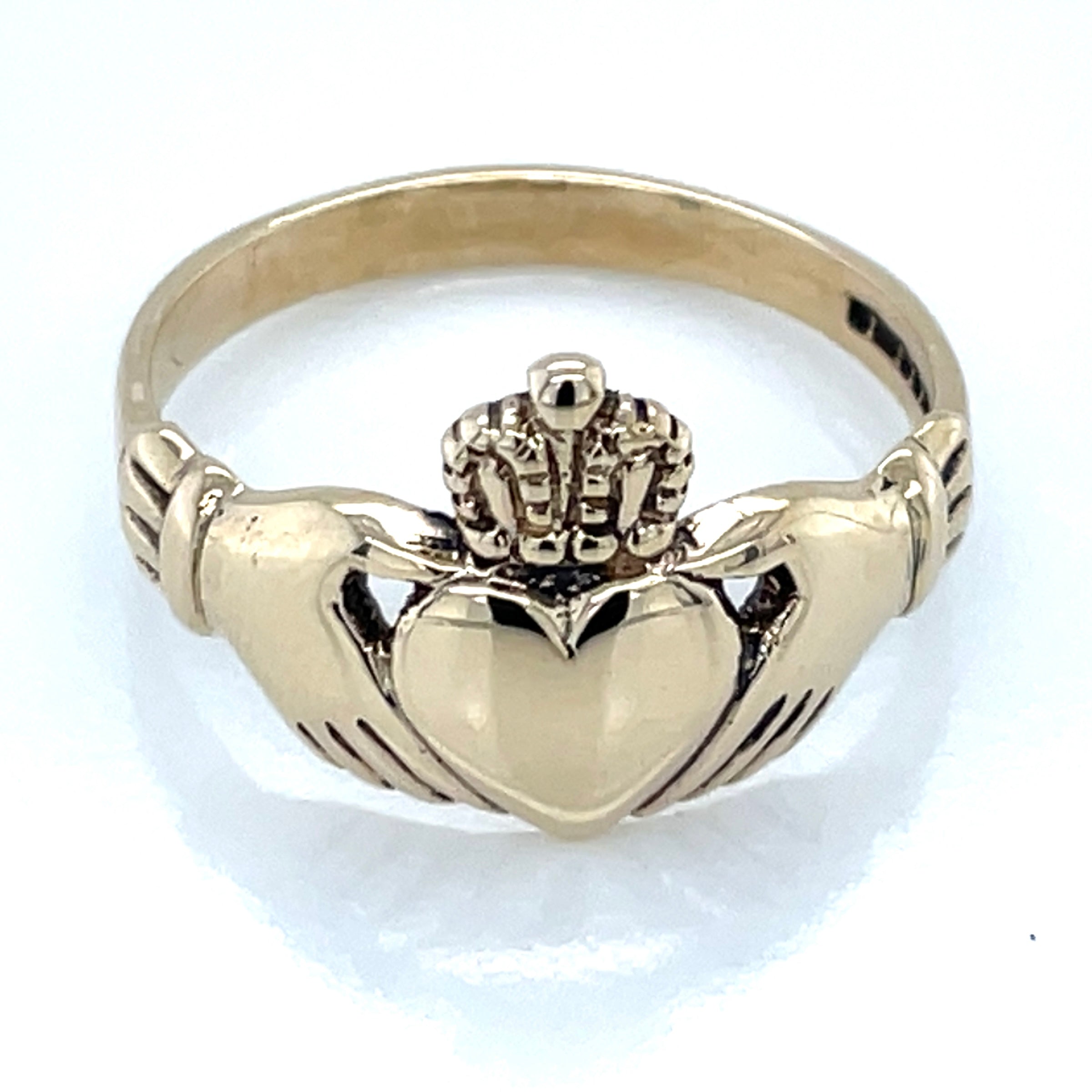 This vintage 9ct yellow gold Claddagh ring is the perfect addition to any gentleman's collection. With a plain polished finish, it exudes a timeless elegance that never goes out of style. Crafted from high-quality materials, it is a durable and sophisticated piece that will add a touch of class to any outfit. Own a piece of history with this vintage Claddagh ring.