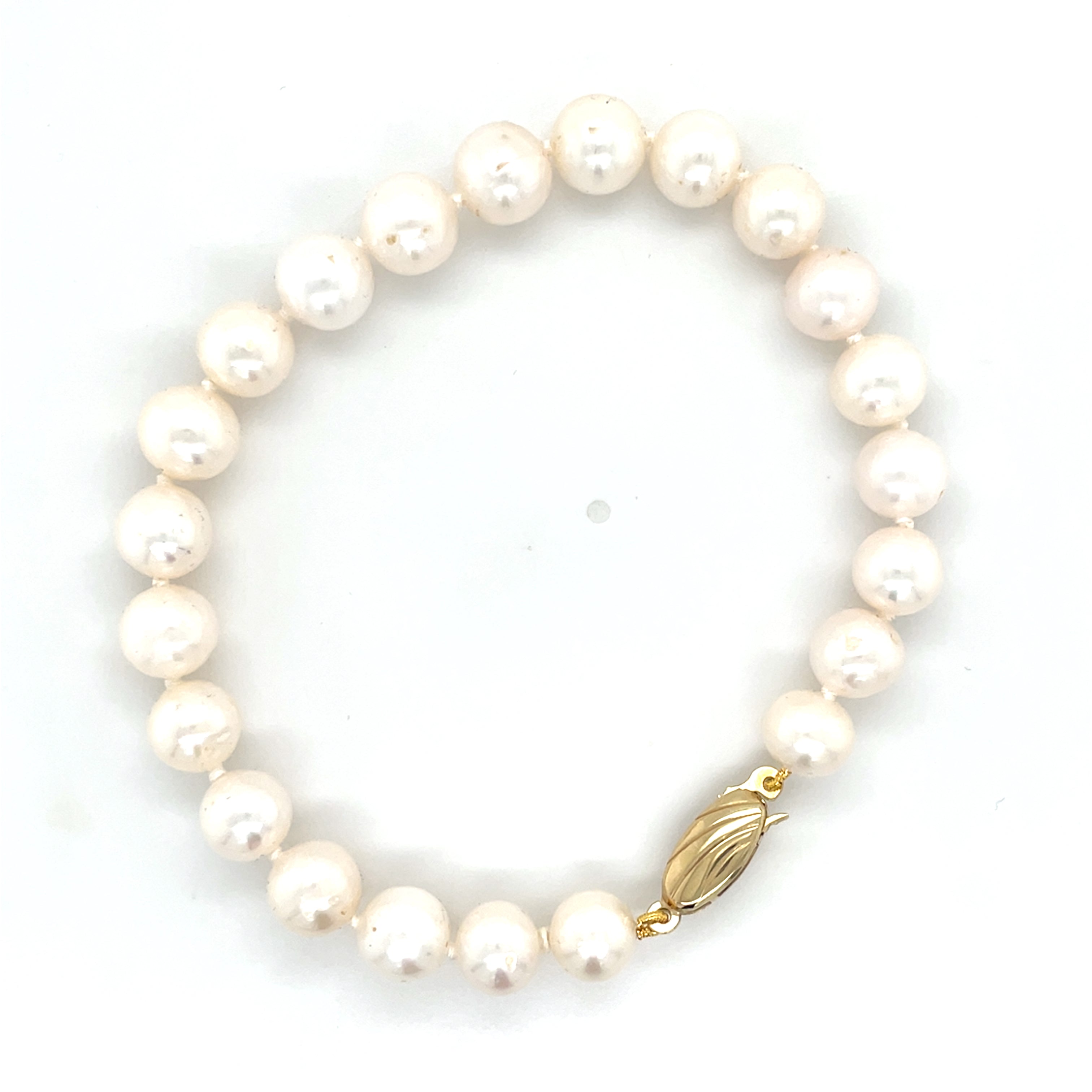 This 9ct yellow gold bracelet features 7.5-8mm freshwater cultured pearls and a secure safety catch. Elevate your style with the timeless elegance and natural beauty of genuine pearls. Perfect for any occasion, add a touch of sophistication to your wardrobe with this stunning piece.