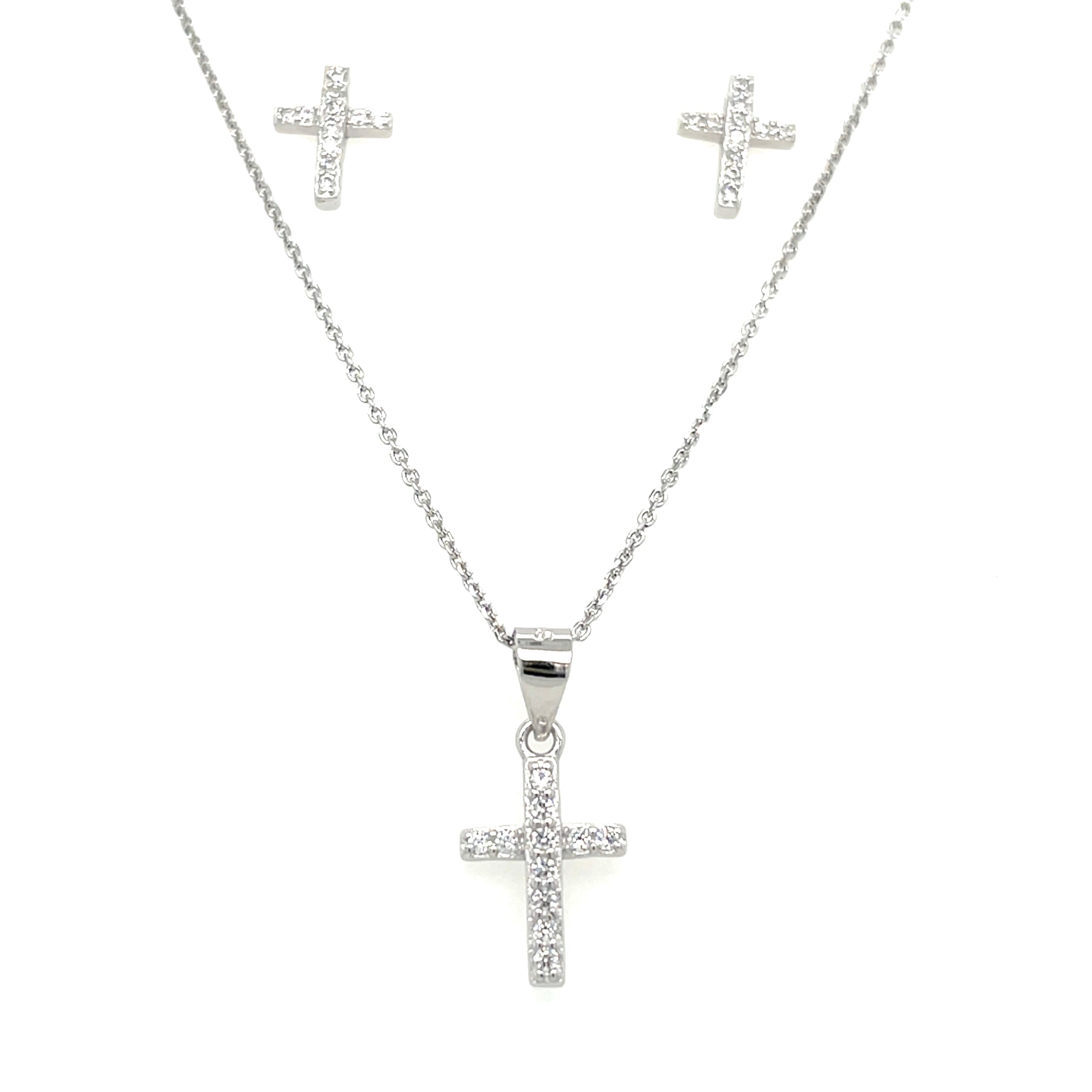 The Sterling Silver Communion CZ Cross Earring and Necklace Set features high-quality sterling silver and cubic zirconia, offering both durability and elegance. This set is ideal for commemorating special occasions, with its classic cross design symbolizing faith. Each piece is crafted for a polished finish, enhancing aesthetic appeal.