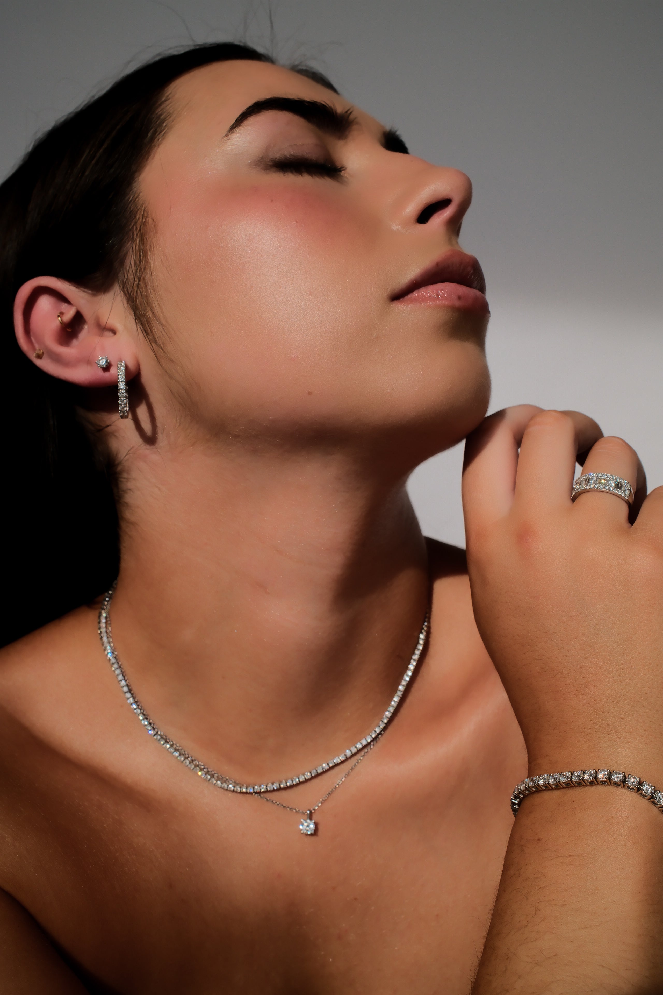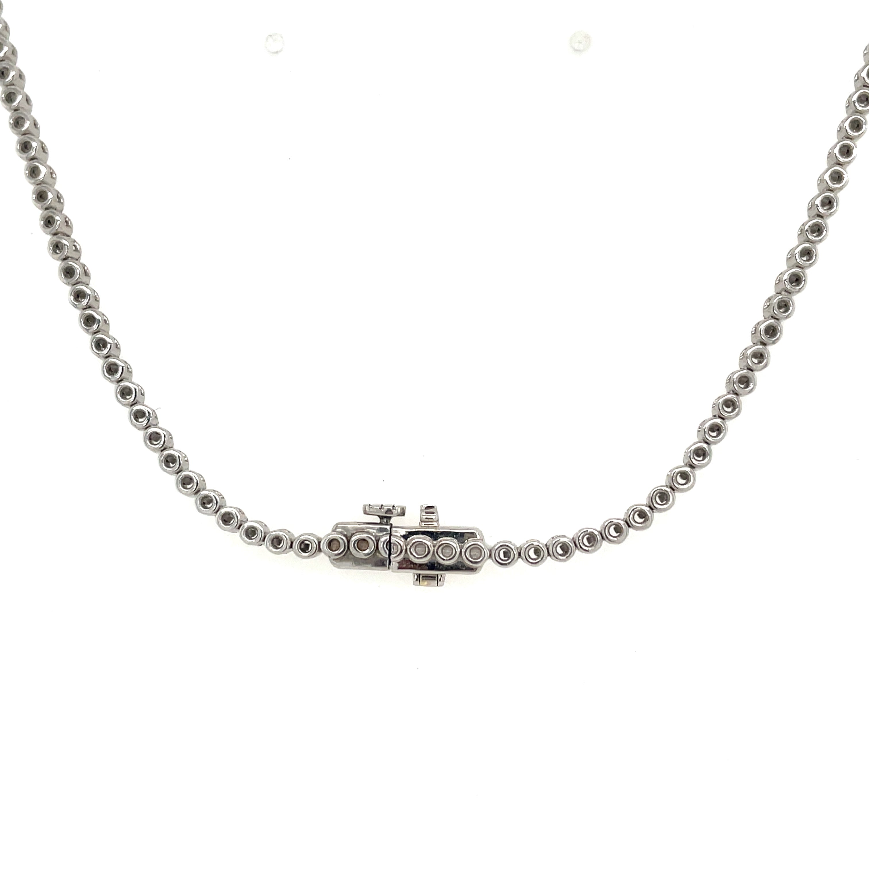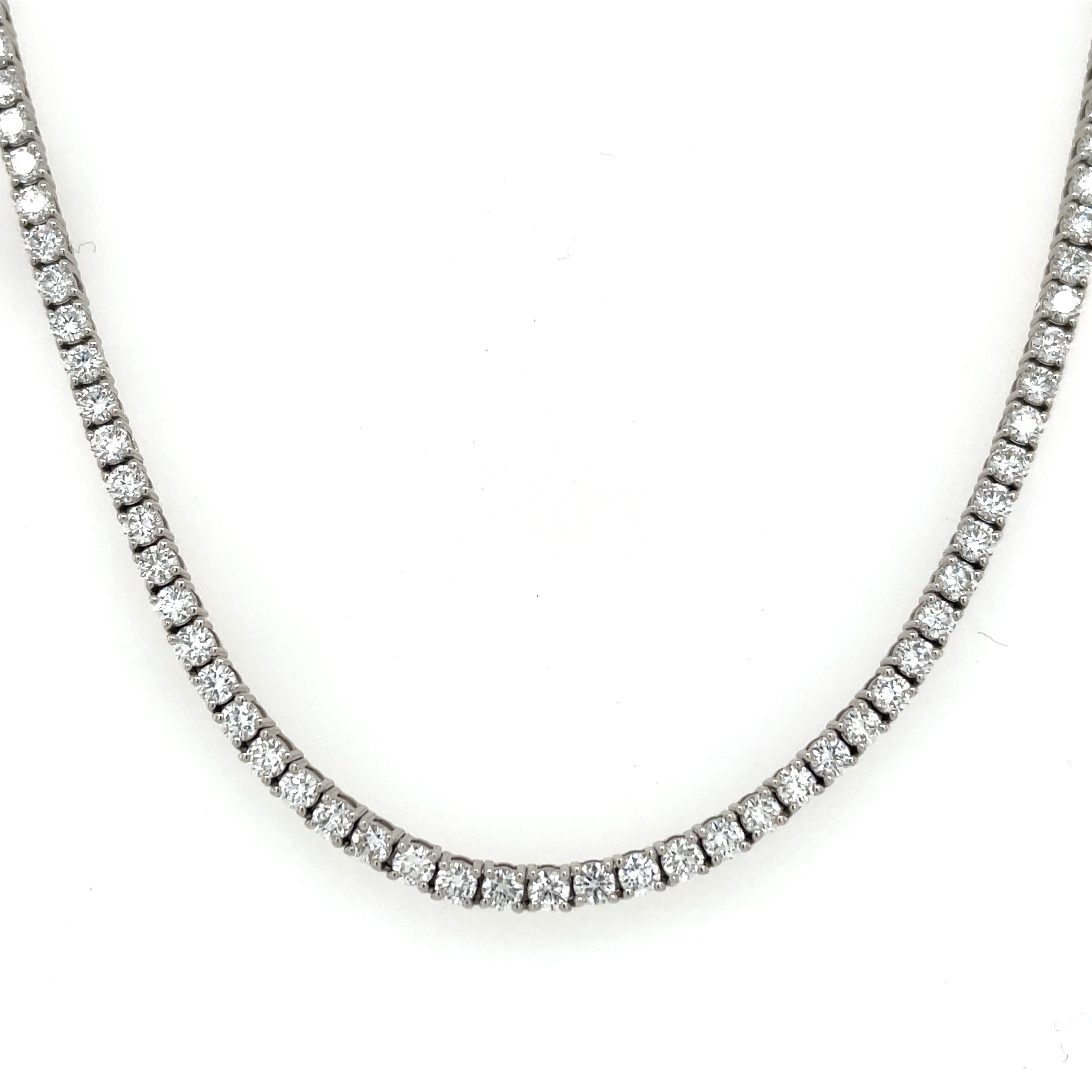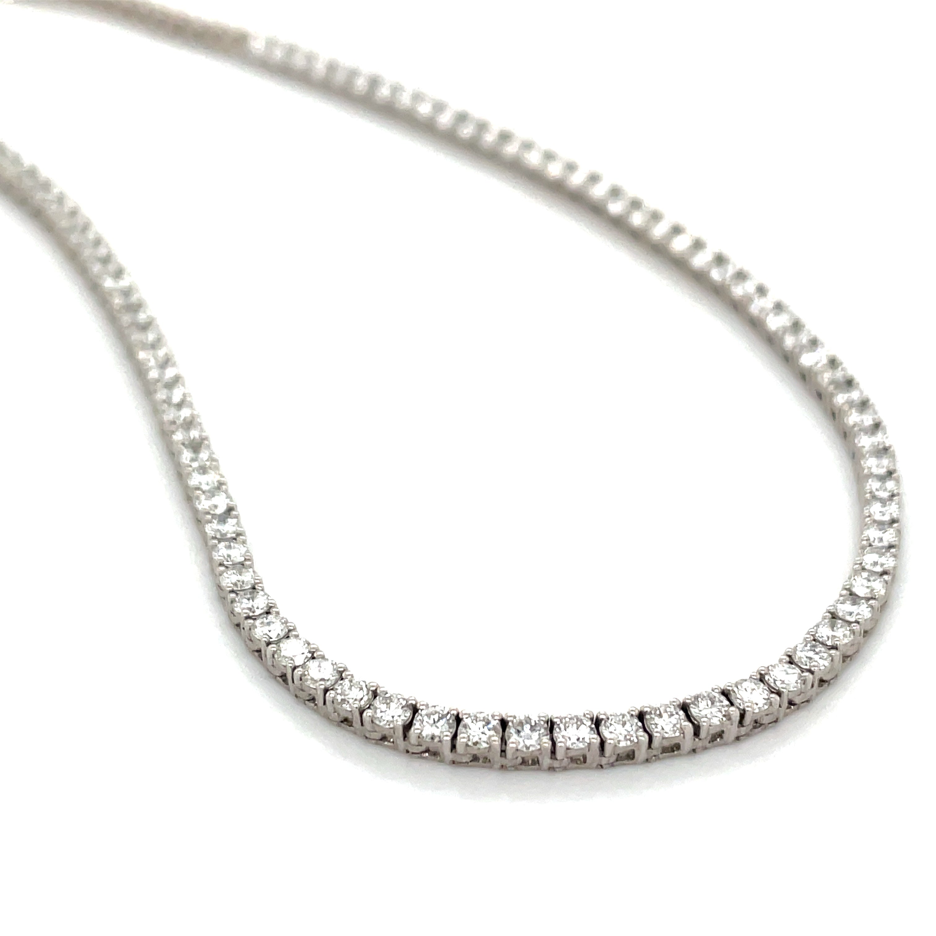 This elegant 14ct white gold tennis necklace features 3.32 / 3.35 carats of laboratory-grown diamonds set in a classic design. Measuring 16 inches in length, it offers a sophisticated look that transitions seamlessly from day to evening wear.
