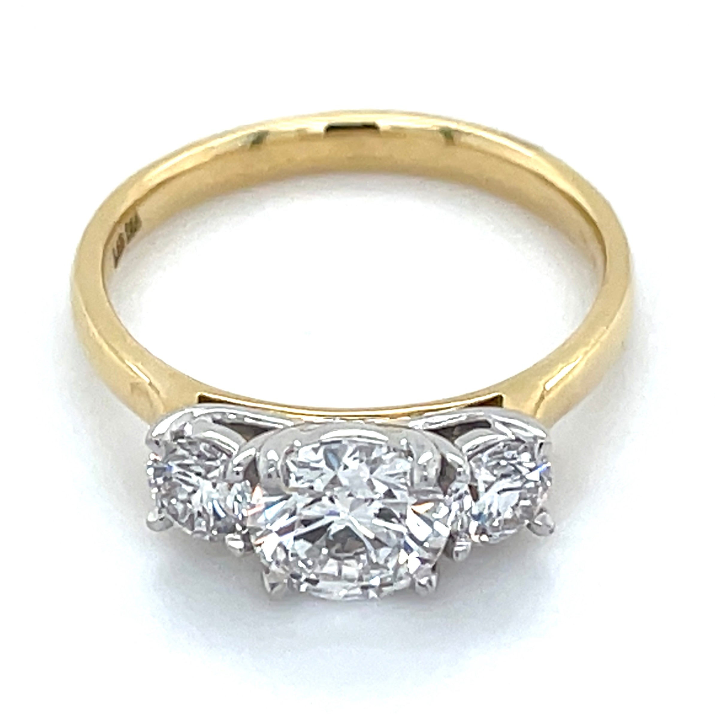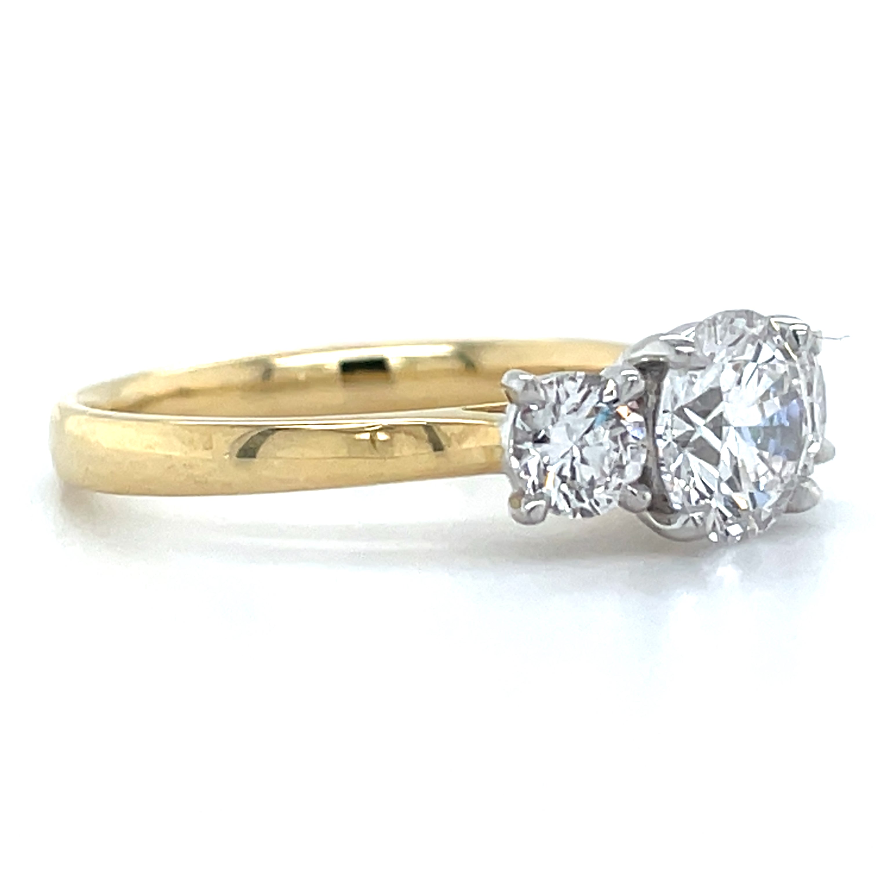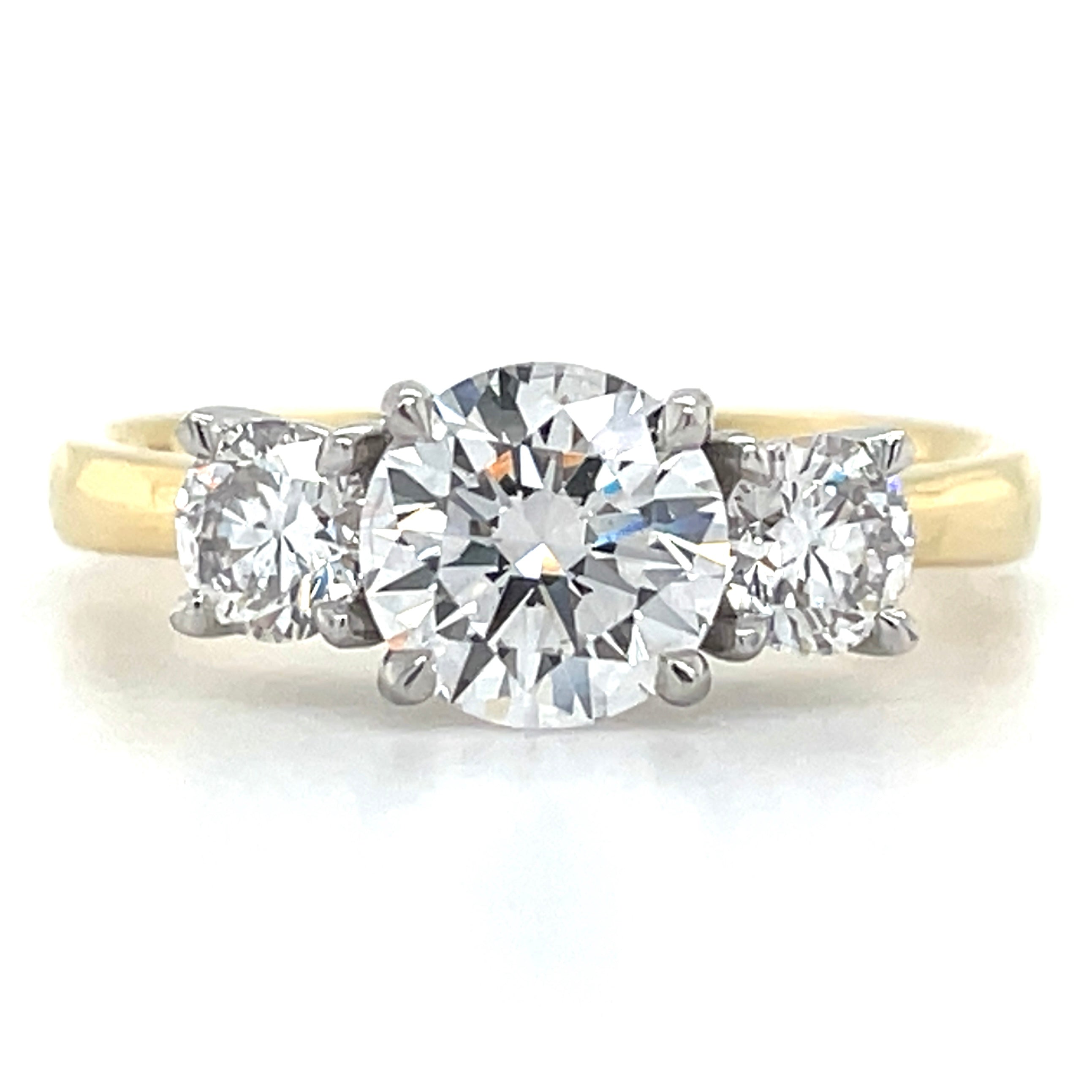 This stunning engagement ring combines the warmth of 18ct yellow gold with a sophisticated platinum head that cradles three brilliant round laboratory-grown diamonds, totalling 1.48ct for exceptional sparkle and brilliance. A modern choice that delivers timeless elegance.