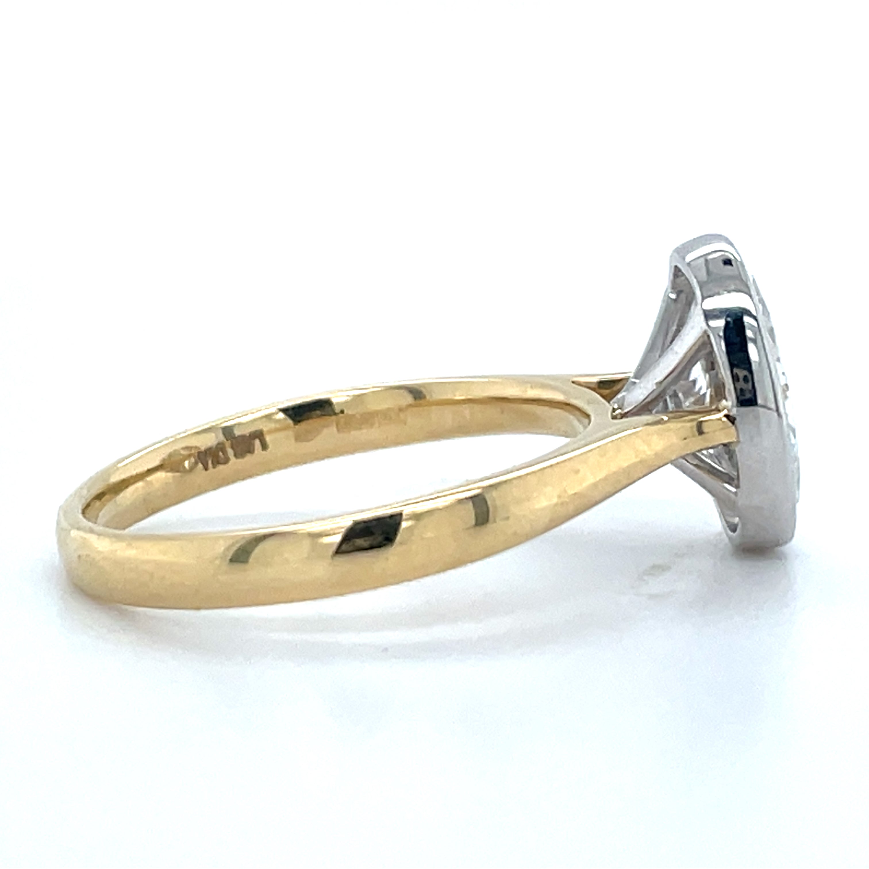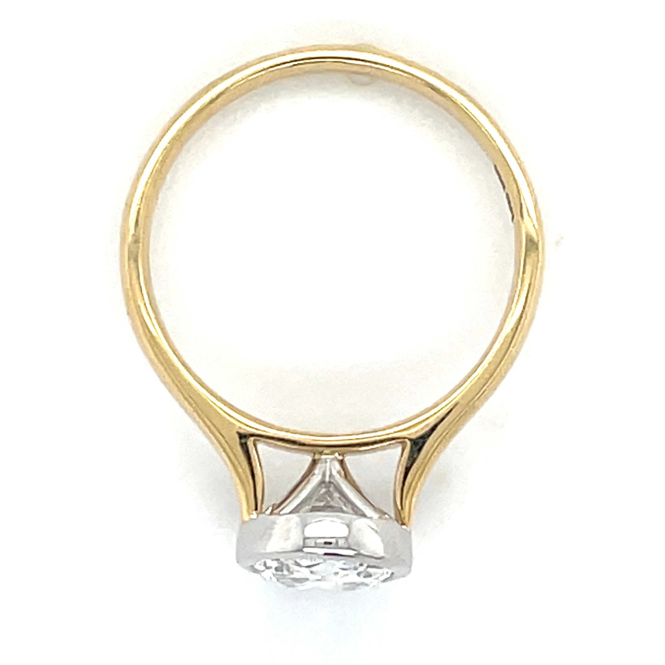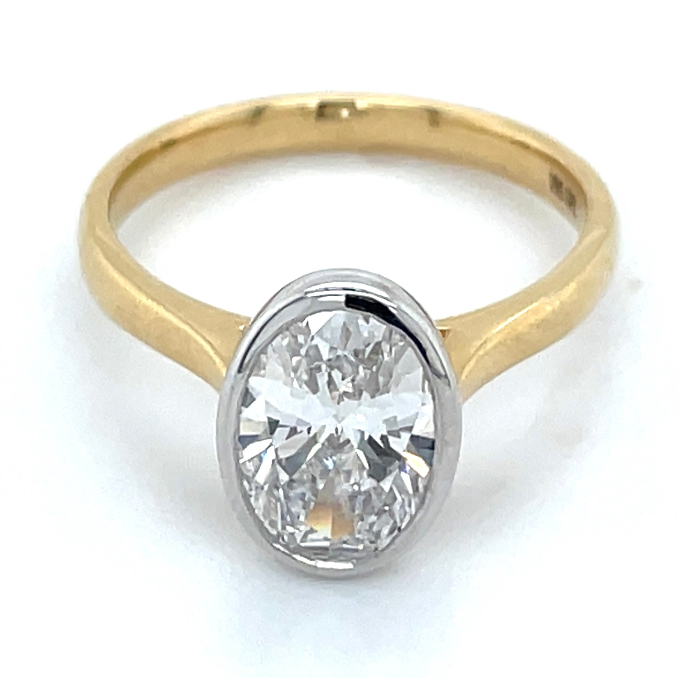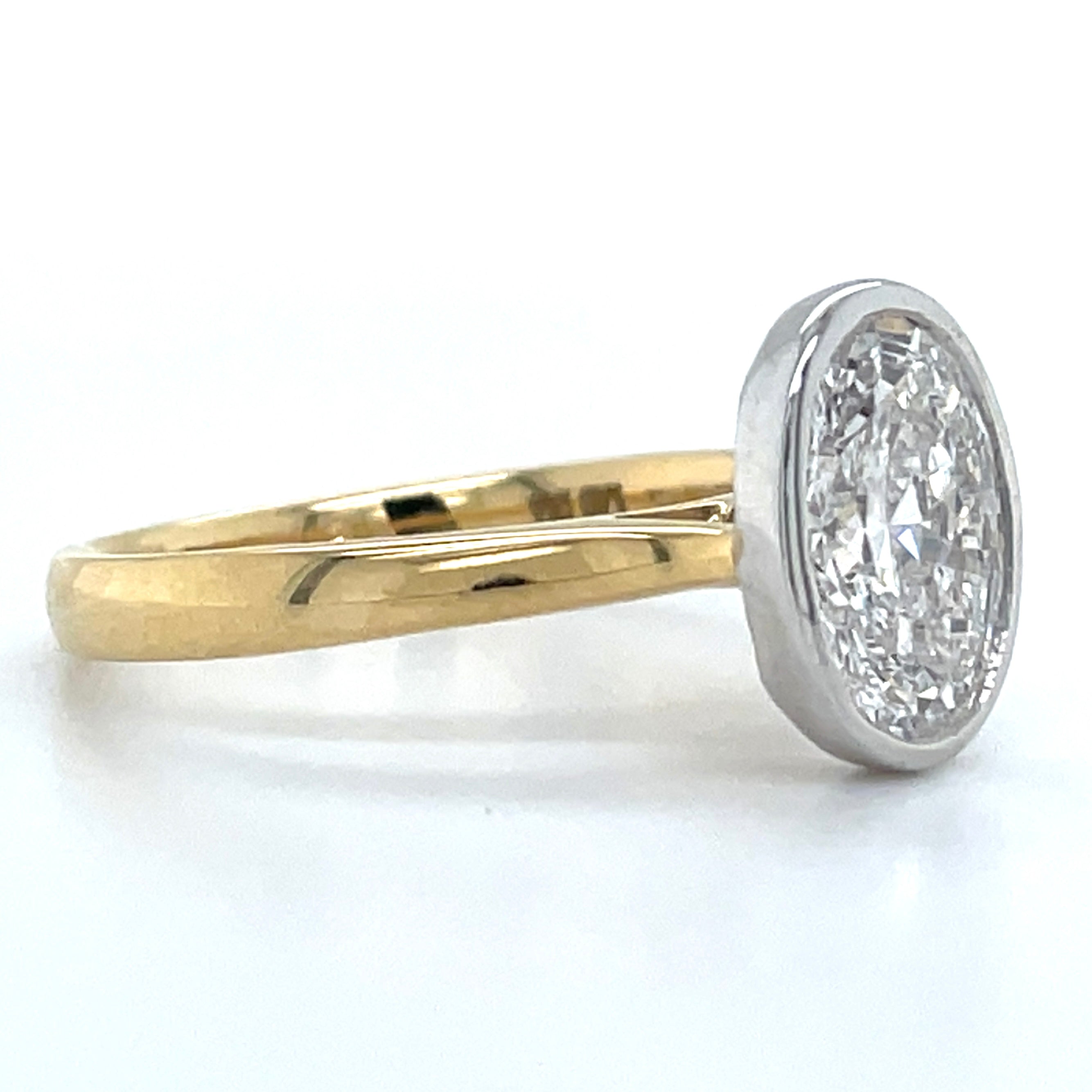 This exceptional engagement ring features a sophisticated 18ct yellow gold band paired with a durable platinum head. At its center, a 2.00ct oval laboratory-grown diamond is expertly bezel set in platinum, offering secure protection while showcasing the stone's brilliance. The centre stone is IGI Certified: