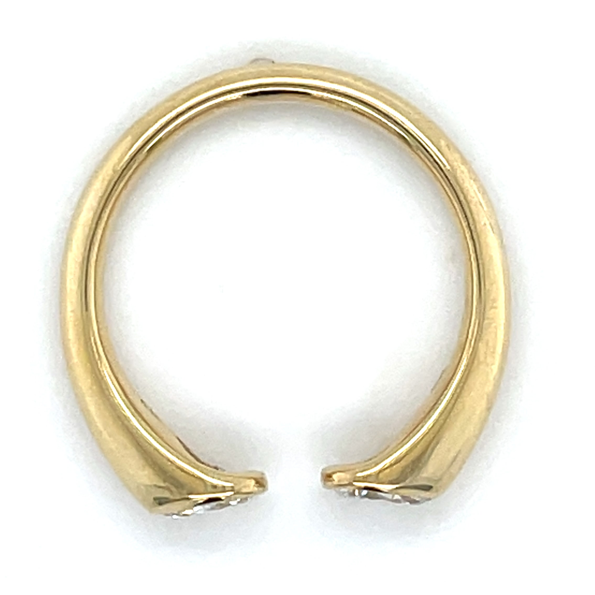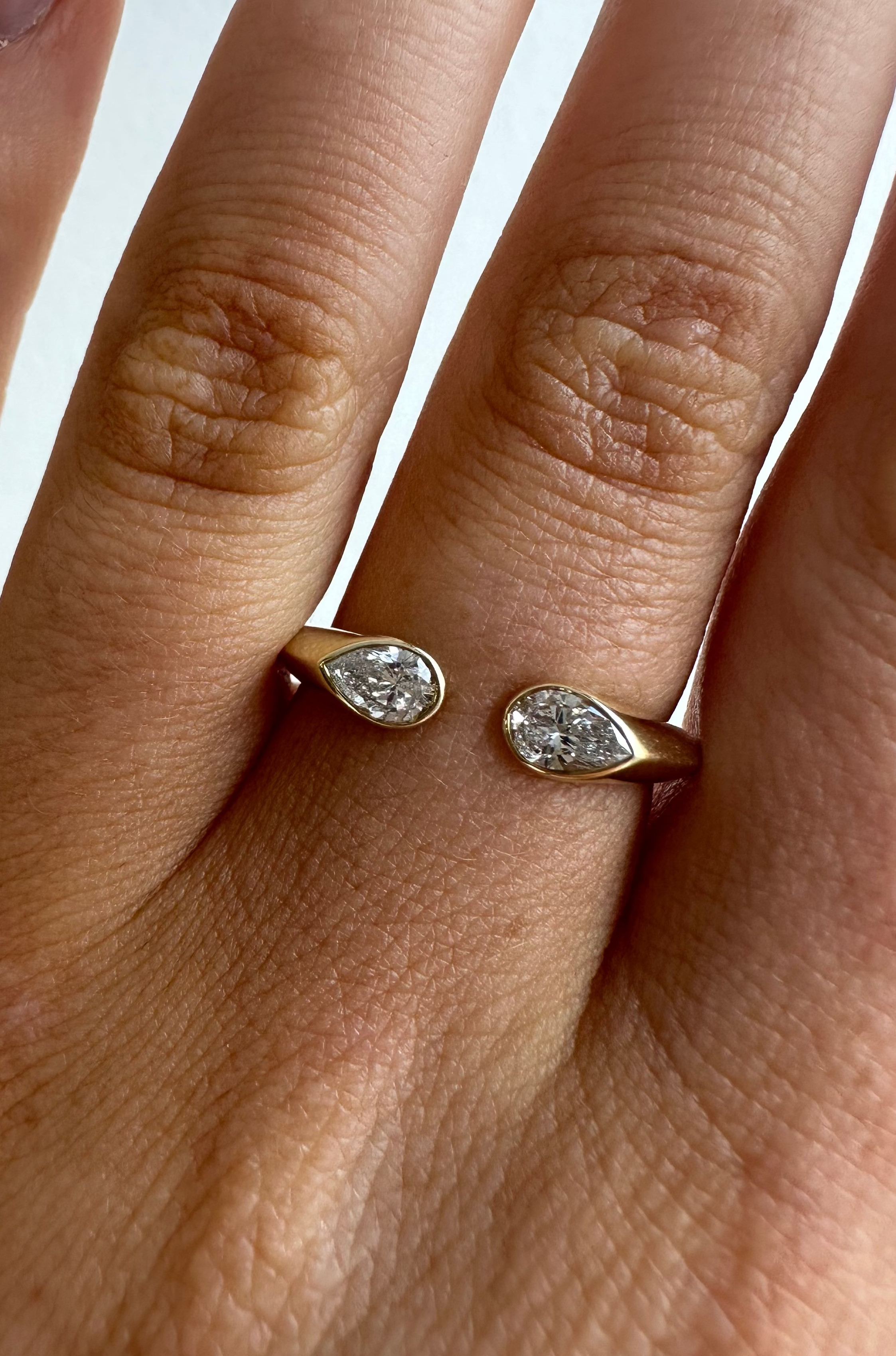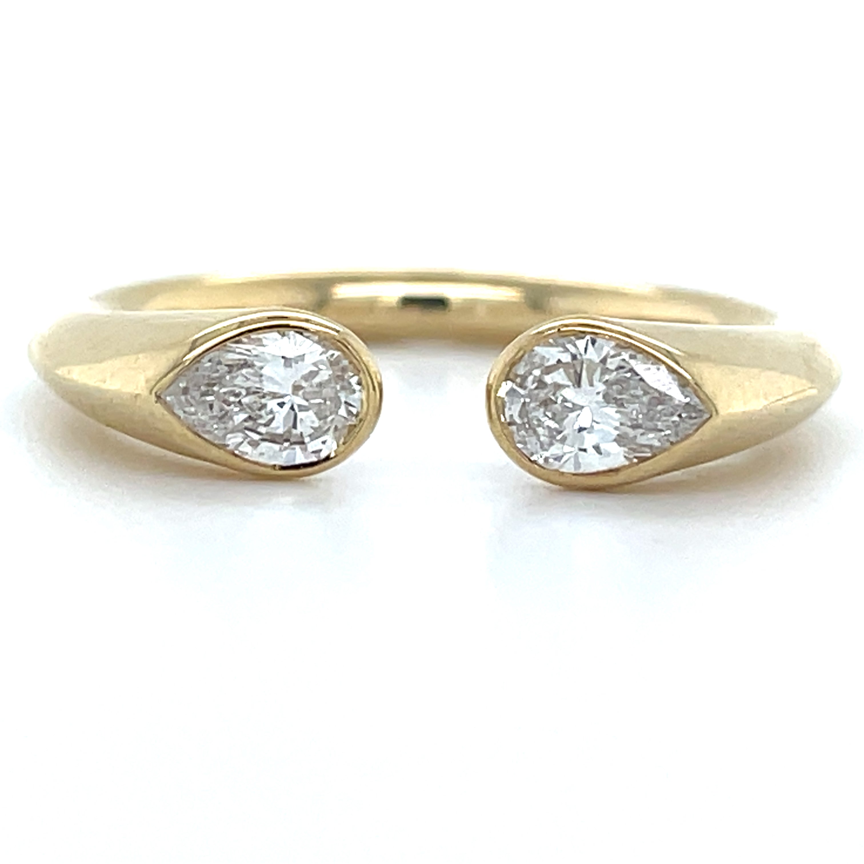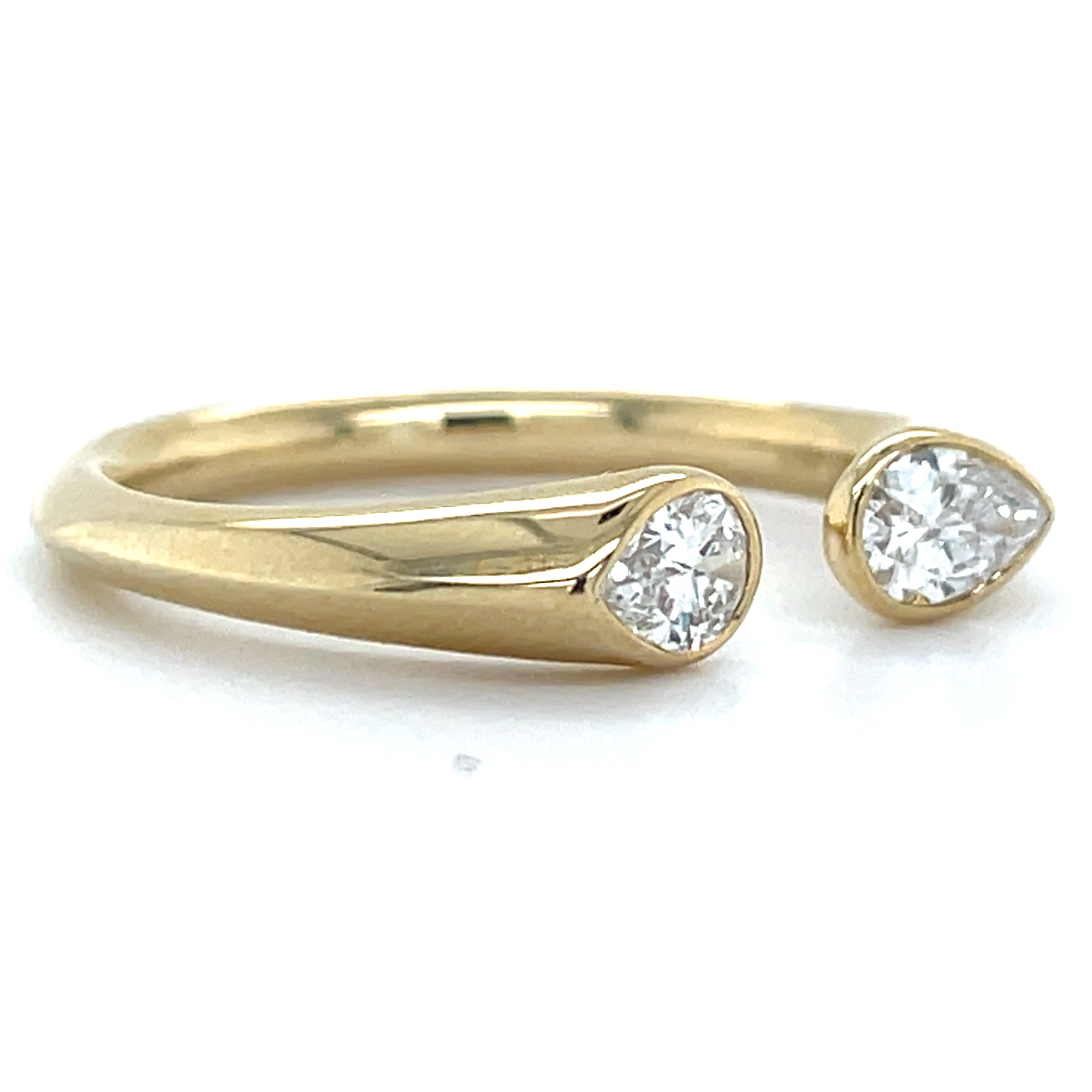 Expertly crafted with 9ct yellow gold, this open ring features two pear diamonds totaling 0.41ct, each laboratory grown for exceptional quality. Elevate your style with the timeless elegance of this bezel set diamond ring.