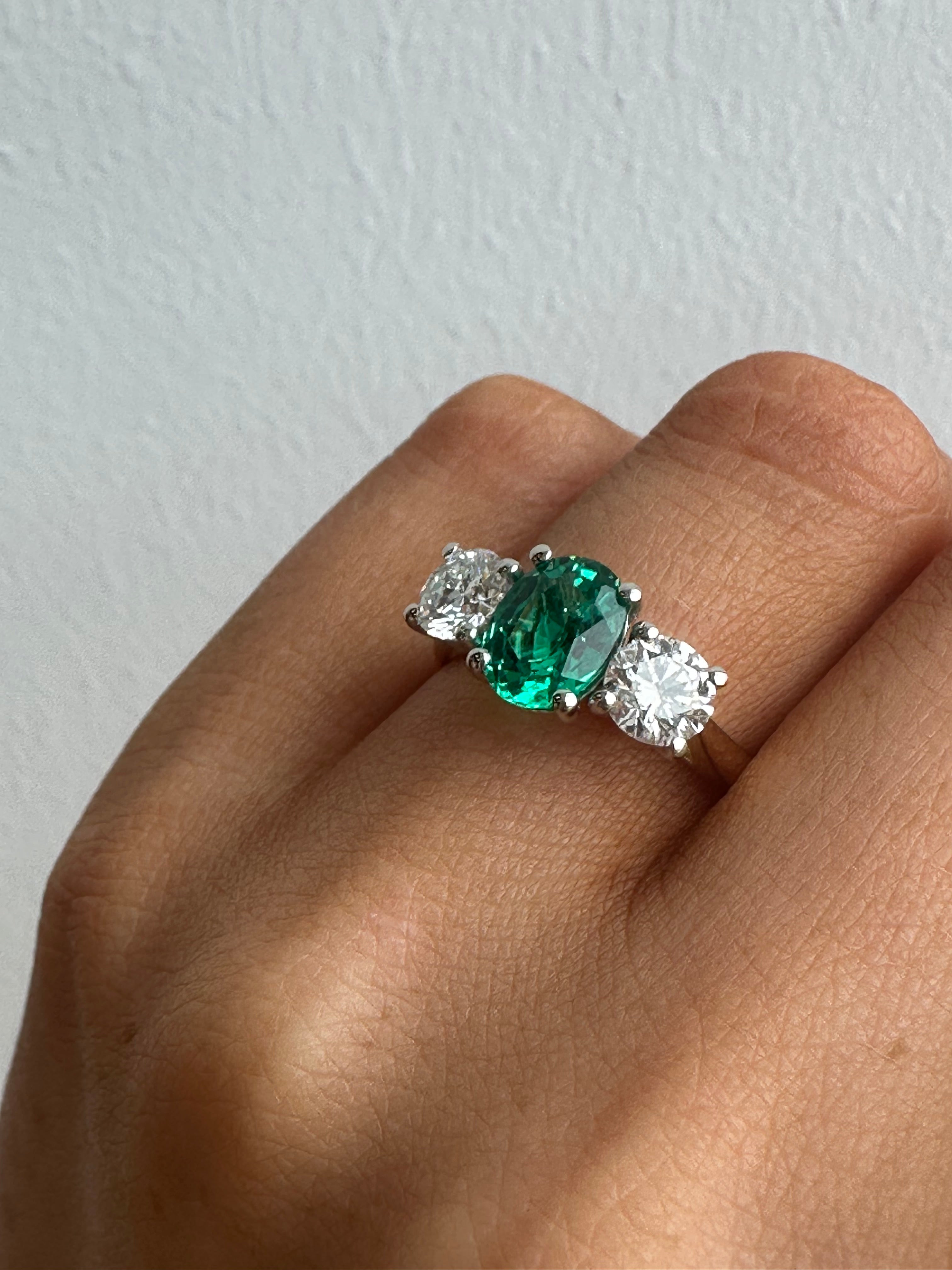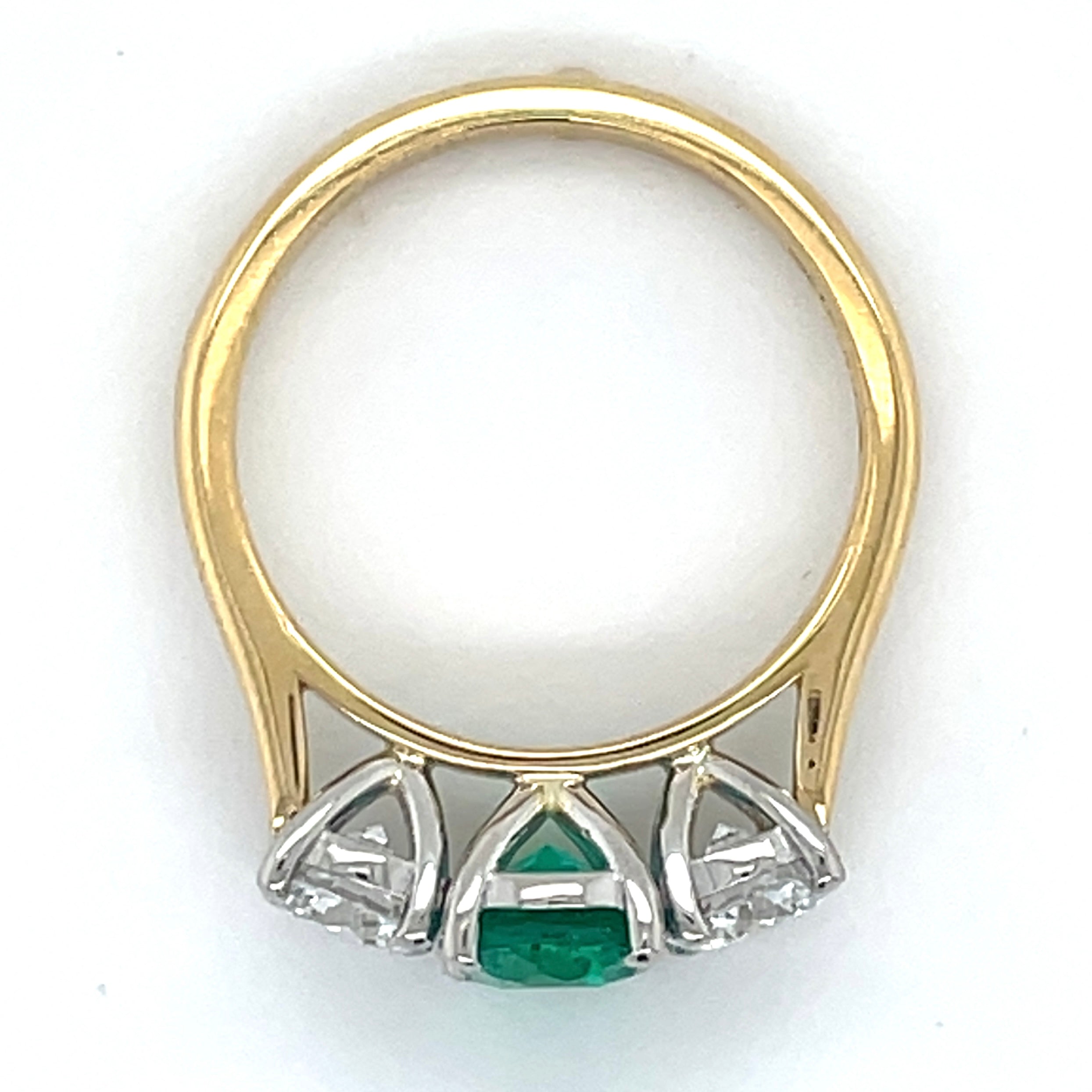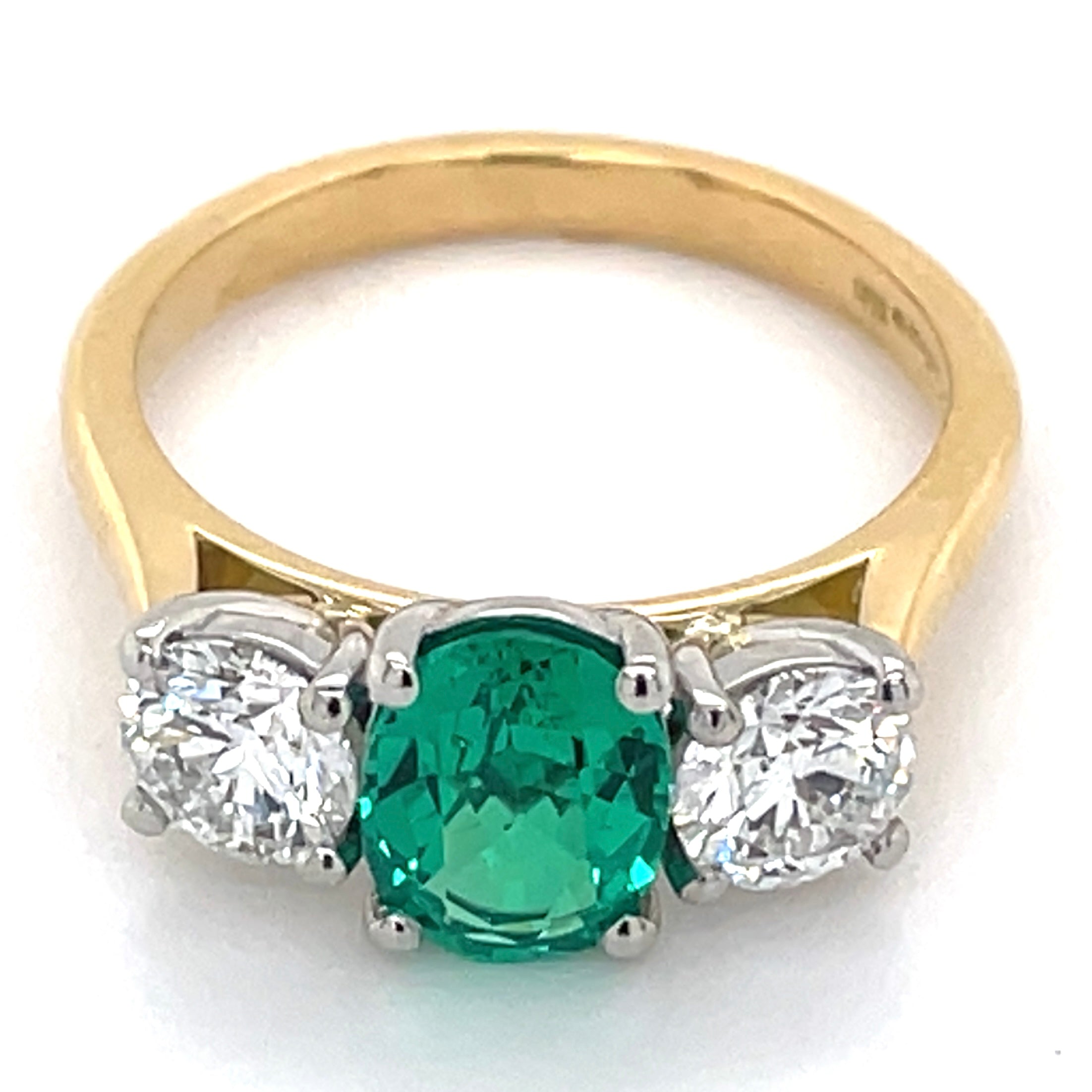 This exquisite 18ct yellow gold ring features a 1.24ct laboratory-grown oval emerald set in a platinum mount, showcasing exceptional vibrancy. Flanked by two 0.50/0.52ct laboratory-grown round diamonds, the three-stone design offers a harmonious balance of elegance and brilliance. Crafted with precision, this ring combines sustainable luxury with timeless sophistication.