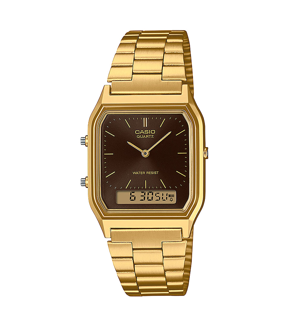 A vintage look in classic colours — case and band in metallic gold finish complemented by a sunray dial in brown. Retro simplicity meets modern functionality in an analogue watch with small digital window for the info you need at your fingertips. A versatile, elegant design to complement every occasion, from dressy formal events to casual outings.