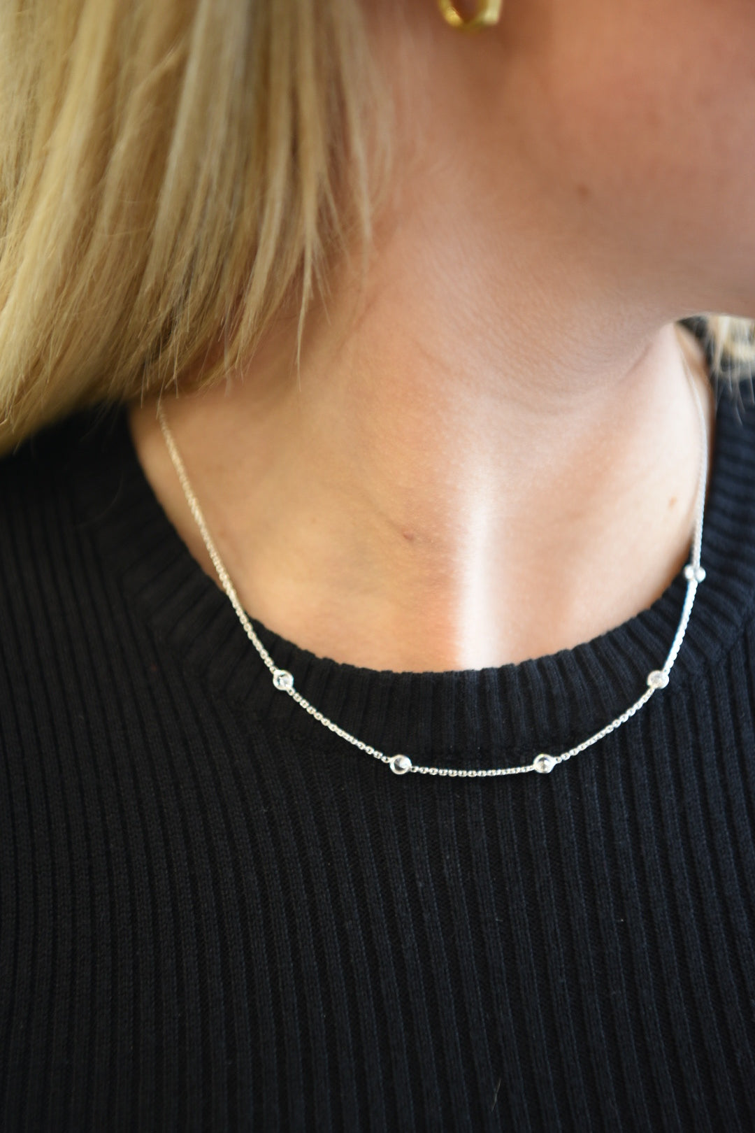 This elegant sterling silver necklace features scattered cubic zirconia stones set in delicate bezels along the chain, creating a sophisticated sparkle with every movement. The 16-inch length offers a versatile fit suitable for layering or wearing alone. A timeless piece that combines understated luxury with everyday wearability.