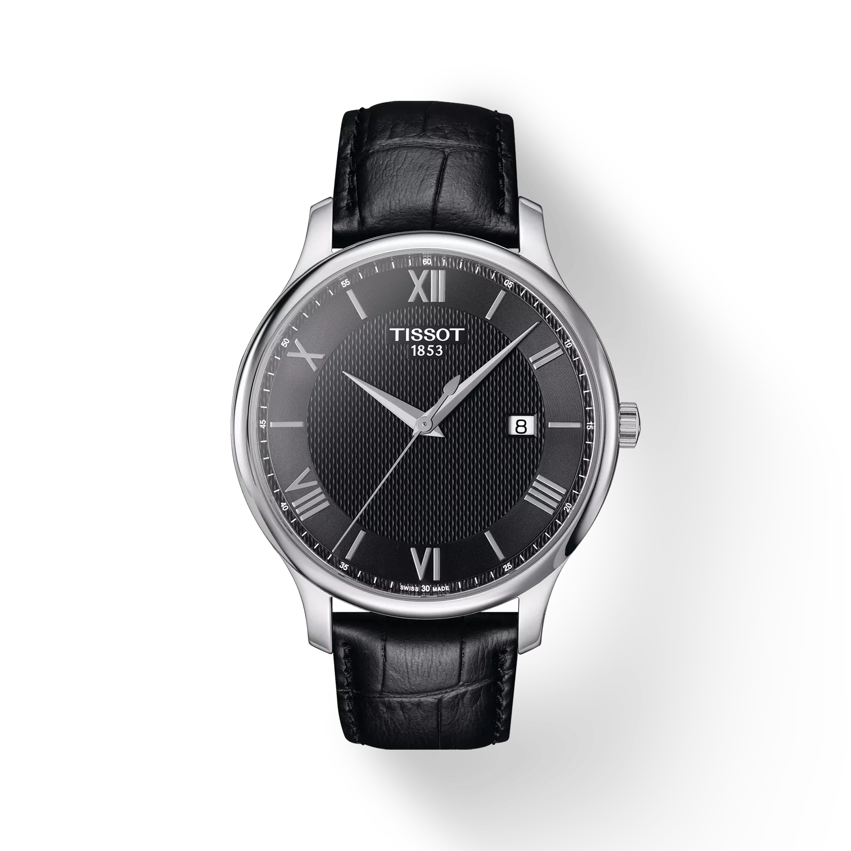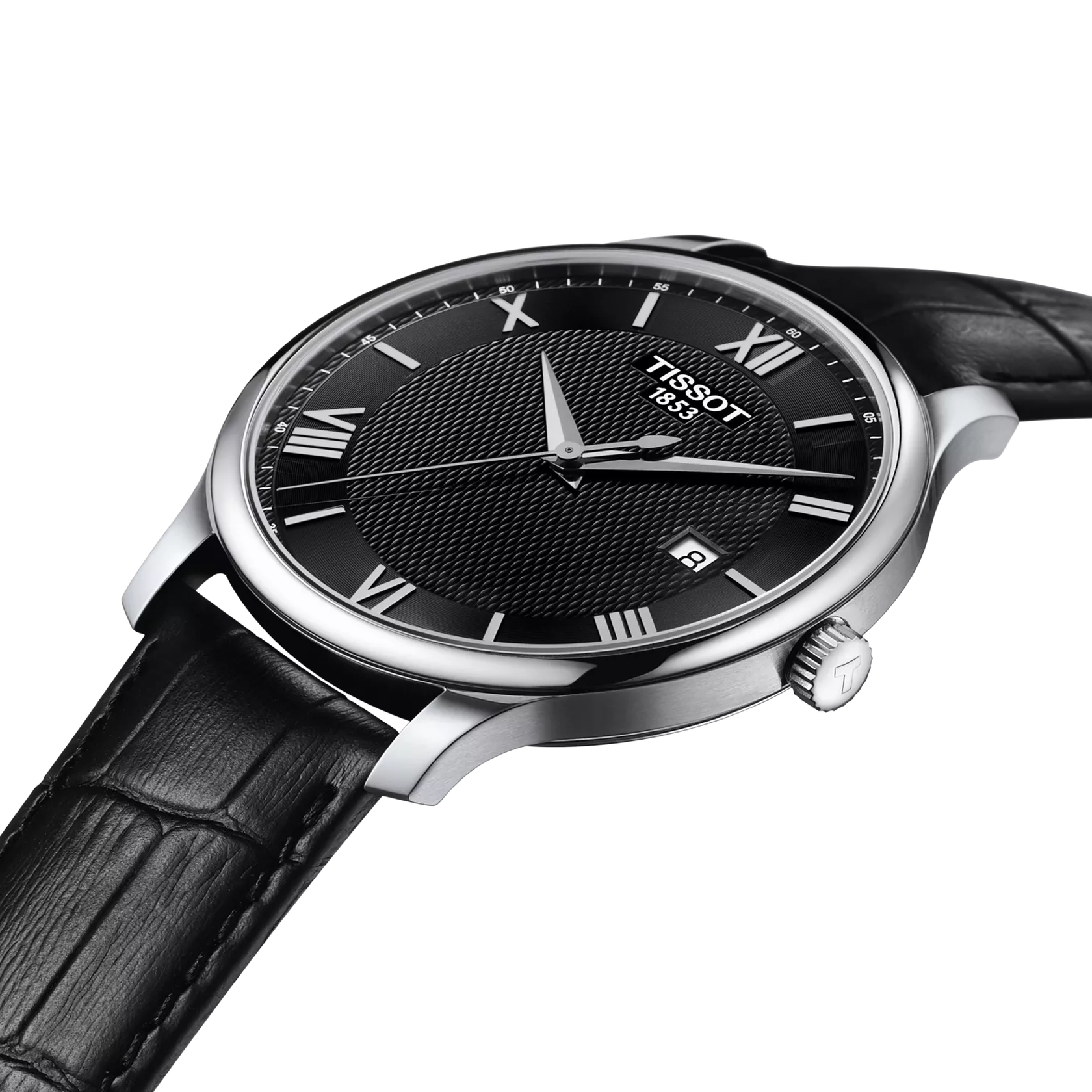 The Tissot Tradition family gives ultra-modern watchmaking a hint of nostalgia with a vintage-style perfectly balanced with classical details and subtle finishes. Discover this 42mm model with its black dial and matching leather strap and give your look a timeless touch.