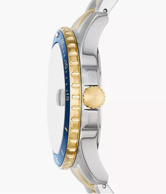 This Fossil Blue Dive watch combines a timeless design with expert craftsmanship. Its two-tone stainless steel bracelet, geometric indices, and unidirectional rotating topring make it a practical and stylish accessory.