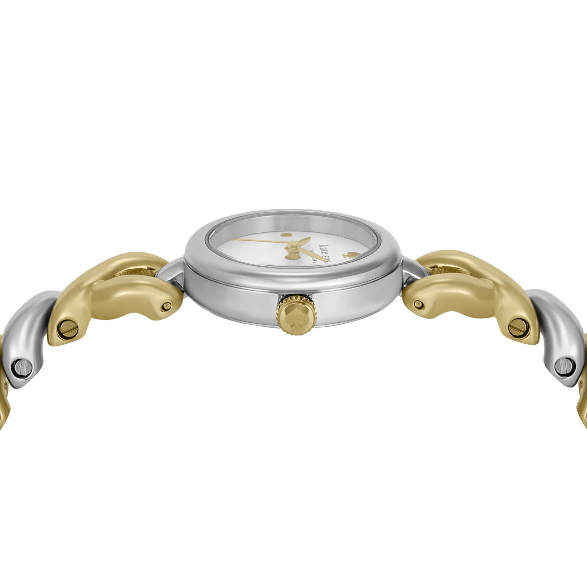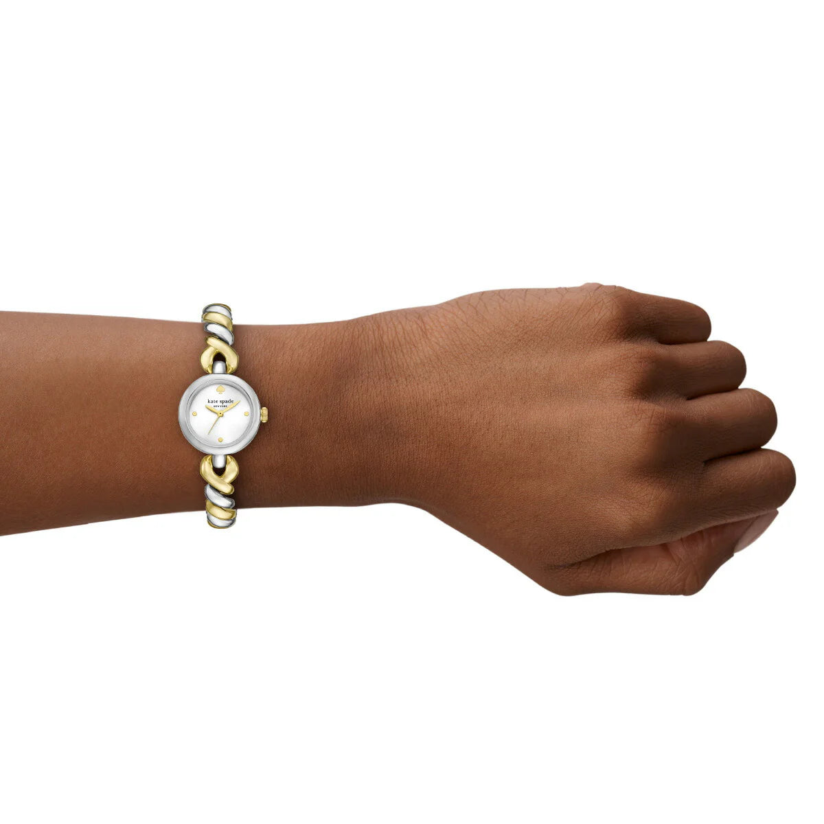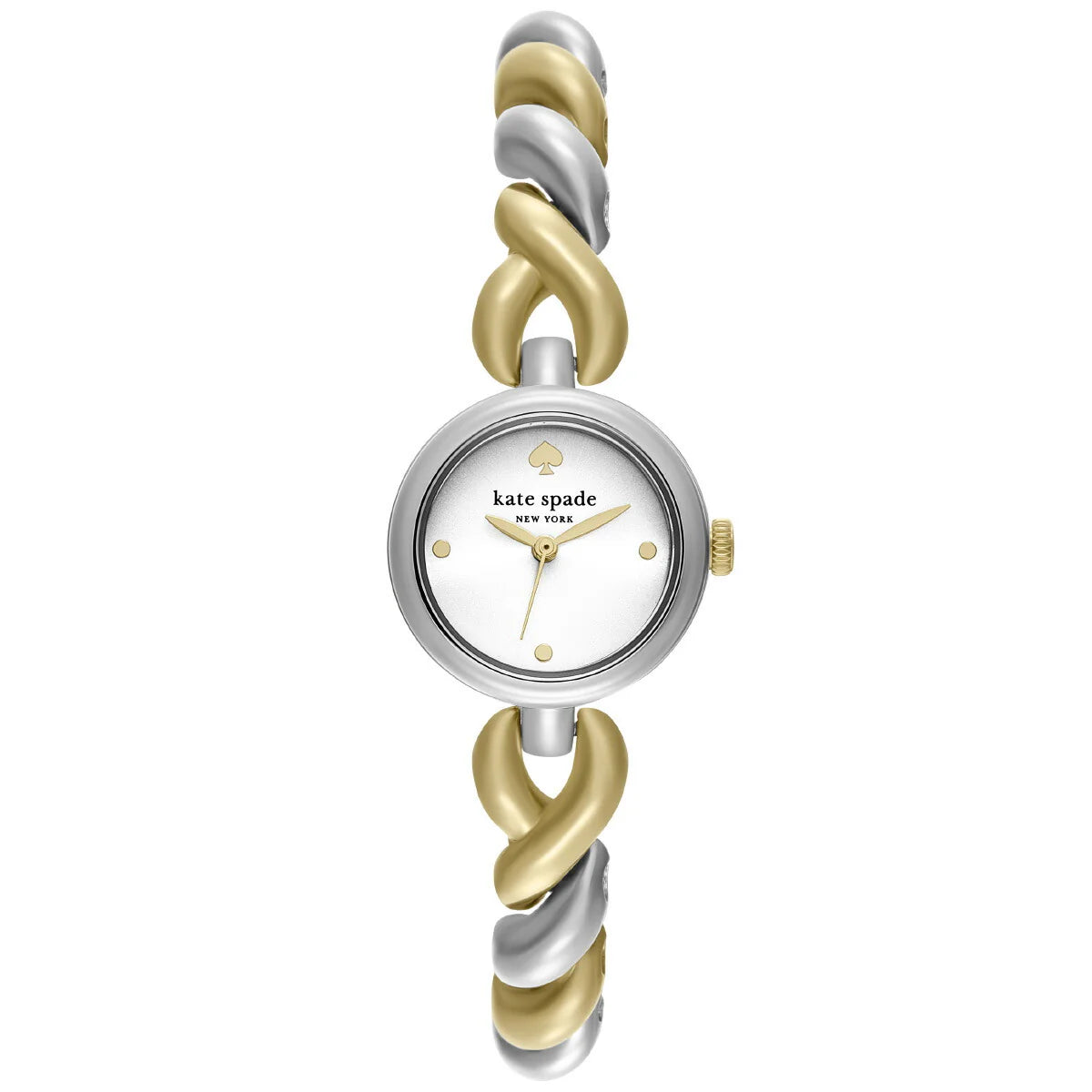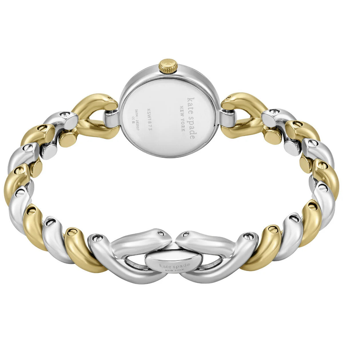 Tap into timeless style with the Kate Spade Monroe Rope Strap Two Tone watch. With a sleek 24mm dial and precise Quartz Three-Hand movement, this monroe platform watch offers both function and fashion. The gold and silver stainless steel strap and case add sophistication, while the adjust-o-matic closure ensures a comfortable and secure fit. Water resistant up to 5 ATM, this watch is both practical and elegant.