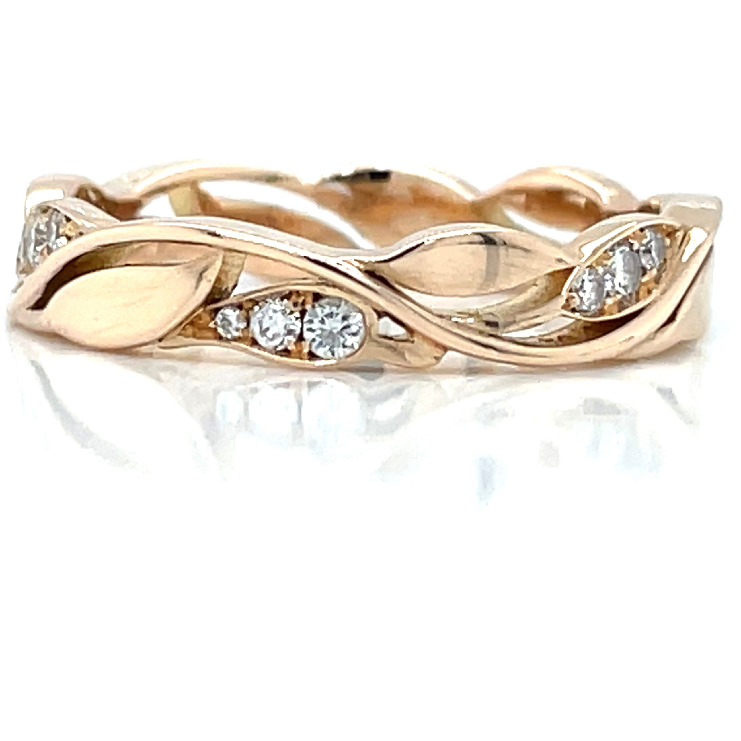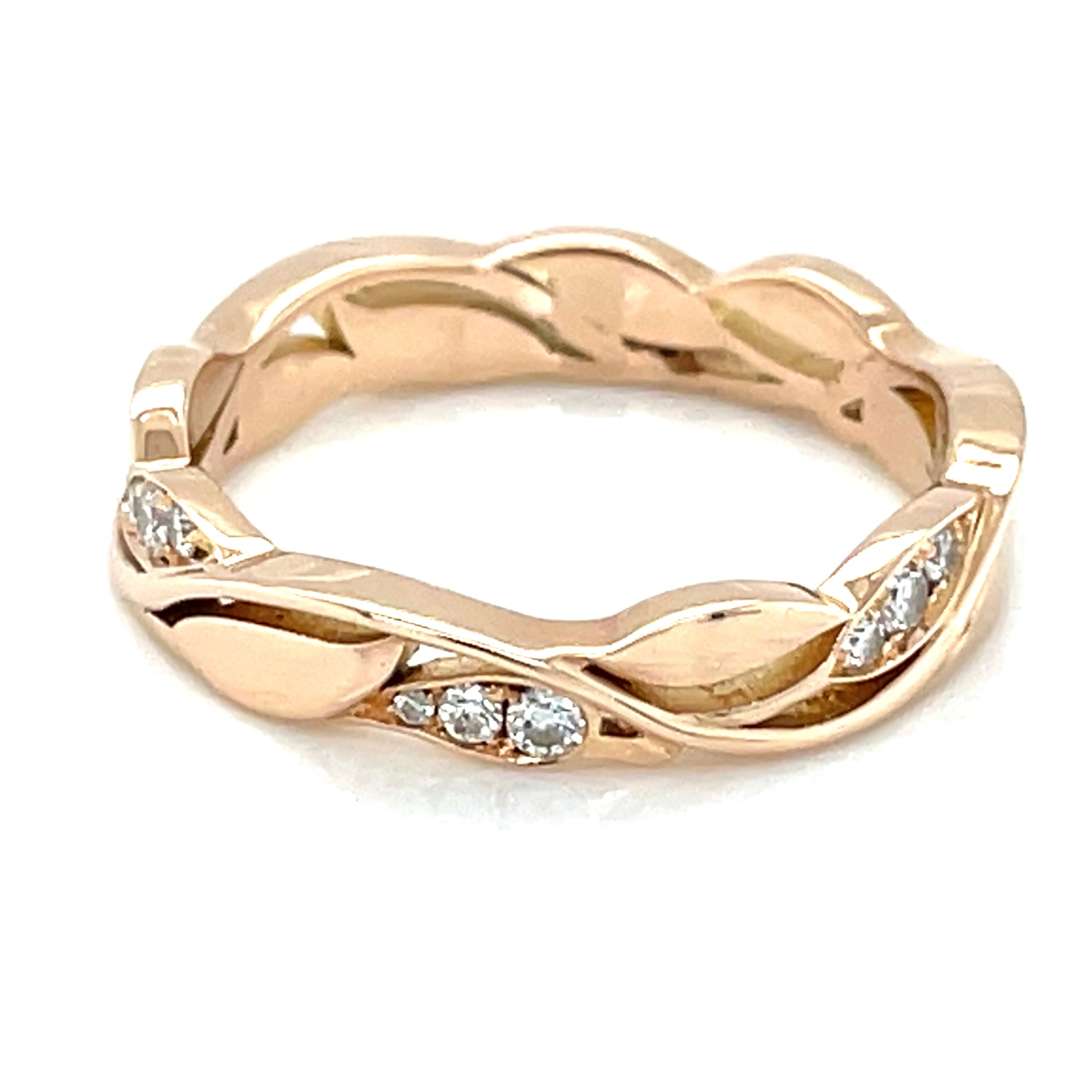 This vintage 18ct rose gold ring boasts approximately .20pts of scattered earth grown diamonds. With its unique and timeless design, this ring is the perfect addition to any collection. Expertly crafted with precision and beauty, this ring offers a luxurious touch to any outfit. Elevate your style with this stunning piece.