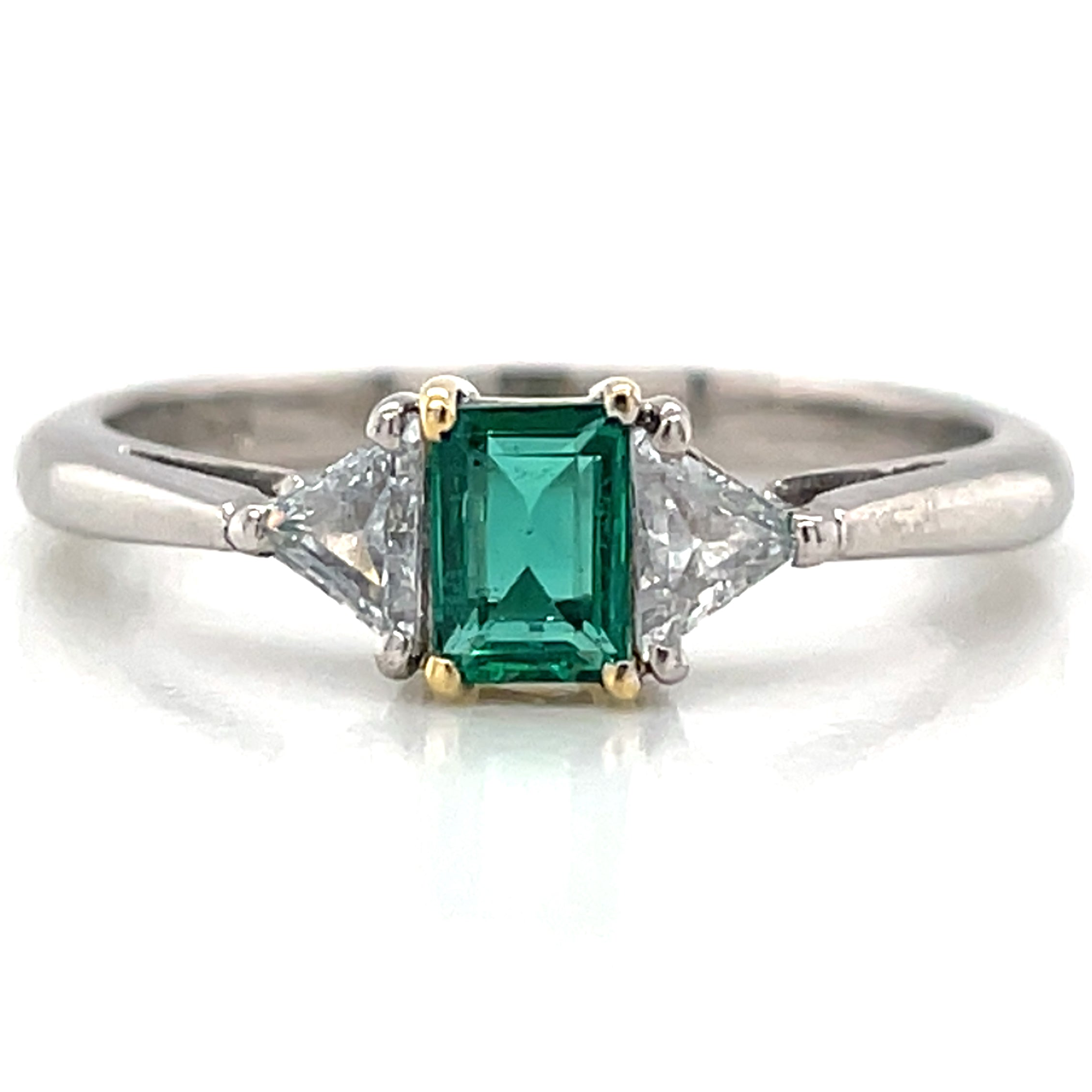 This stunning trilogy ring features a 0.40ct emerald cut emerald gemstone as the center stone, flanked by two diamond side stones totalling 0.20ct. Crafted from 18ct white gold, this vintage piece exudes elegance and sophistication. Add a touch of timeless beauty to your collection with this exquisite ring.