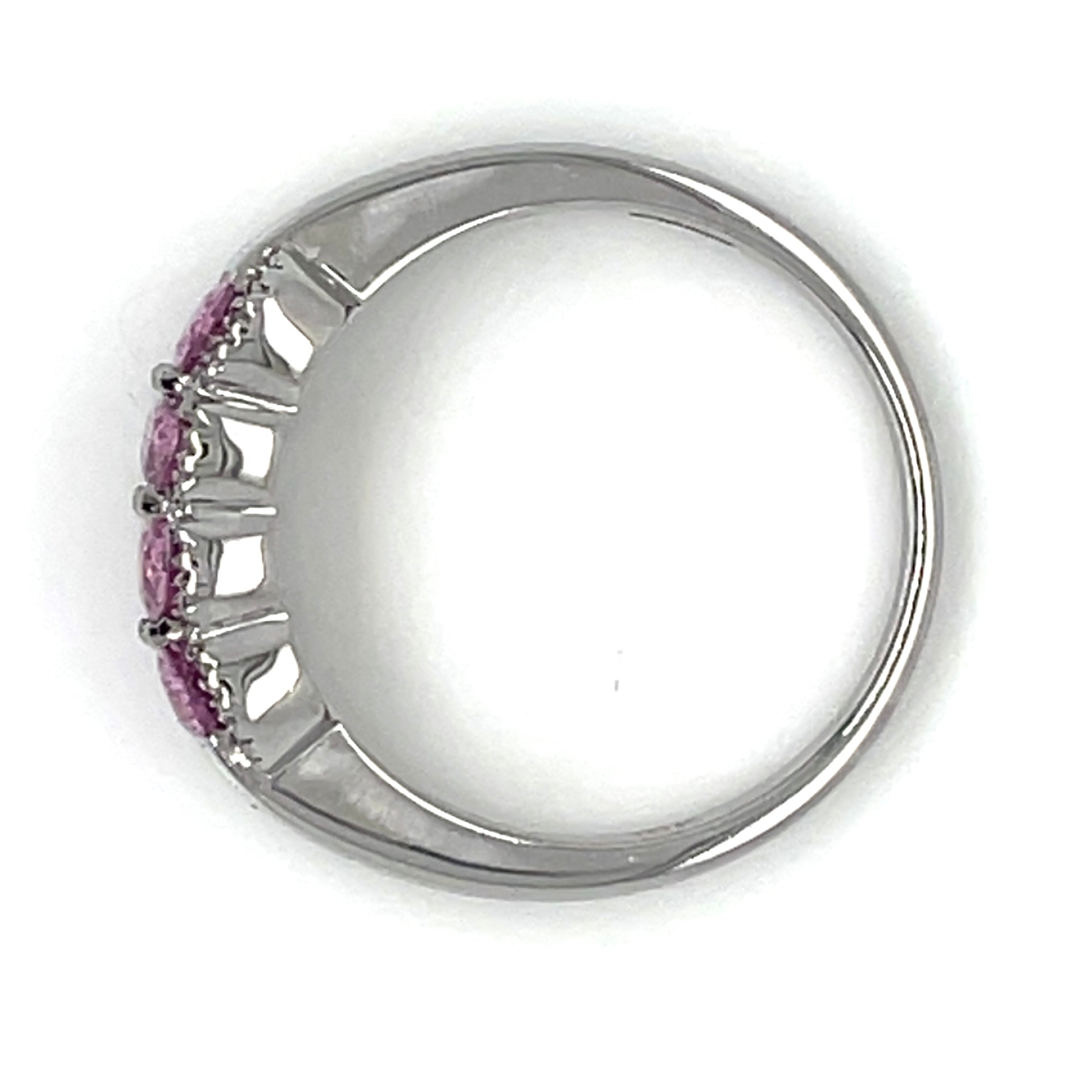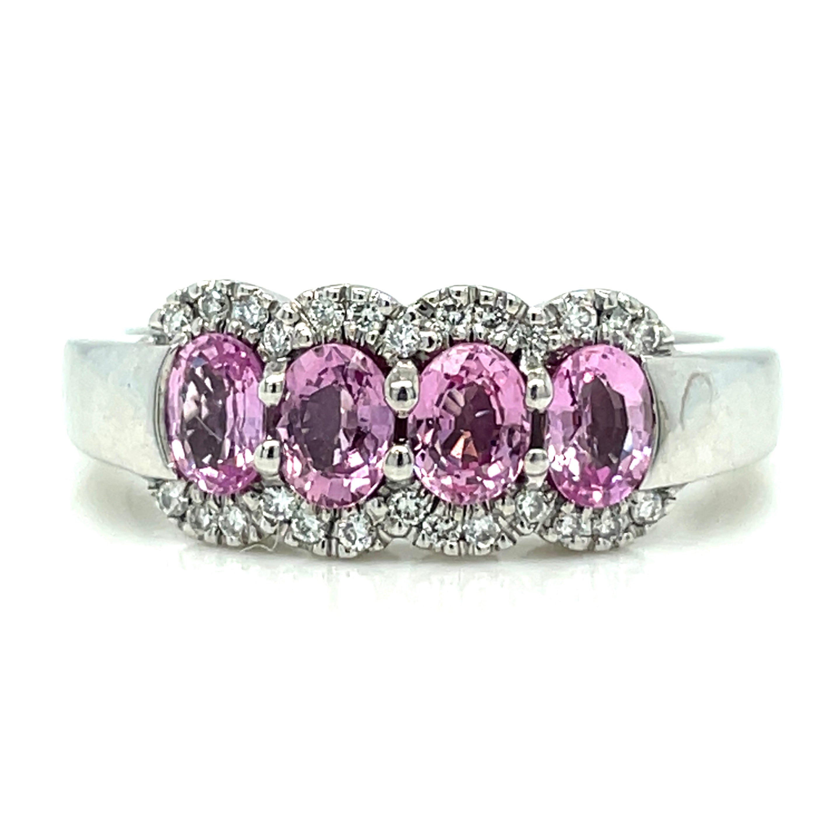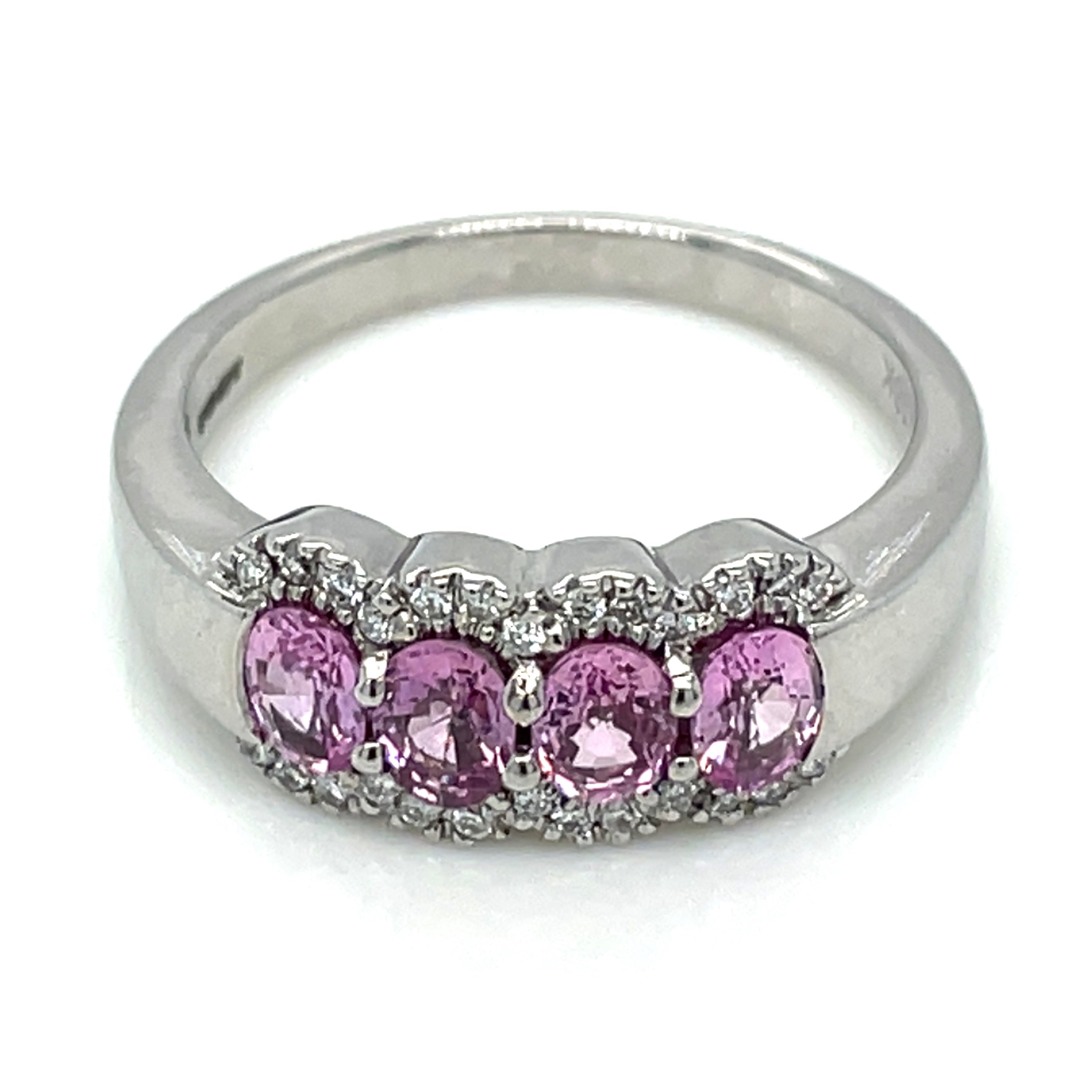 The Vintage White Gold Pink Sapphire and Earth Grown Diamond Ring is a stunning piece, perfect for any occasion. Crafted with 18ct white gold and adorned with 4 beautiful pink sapphires, totaling 0.80ct. The addition of 0.20ct of earth grown diamonds create a semi-halo effect, adding a touch of elegance and sparkle. Expertly designed, this ring is a timeless treasure.
