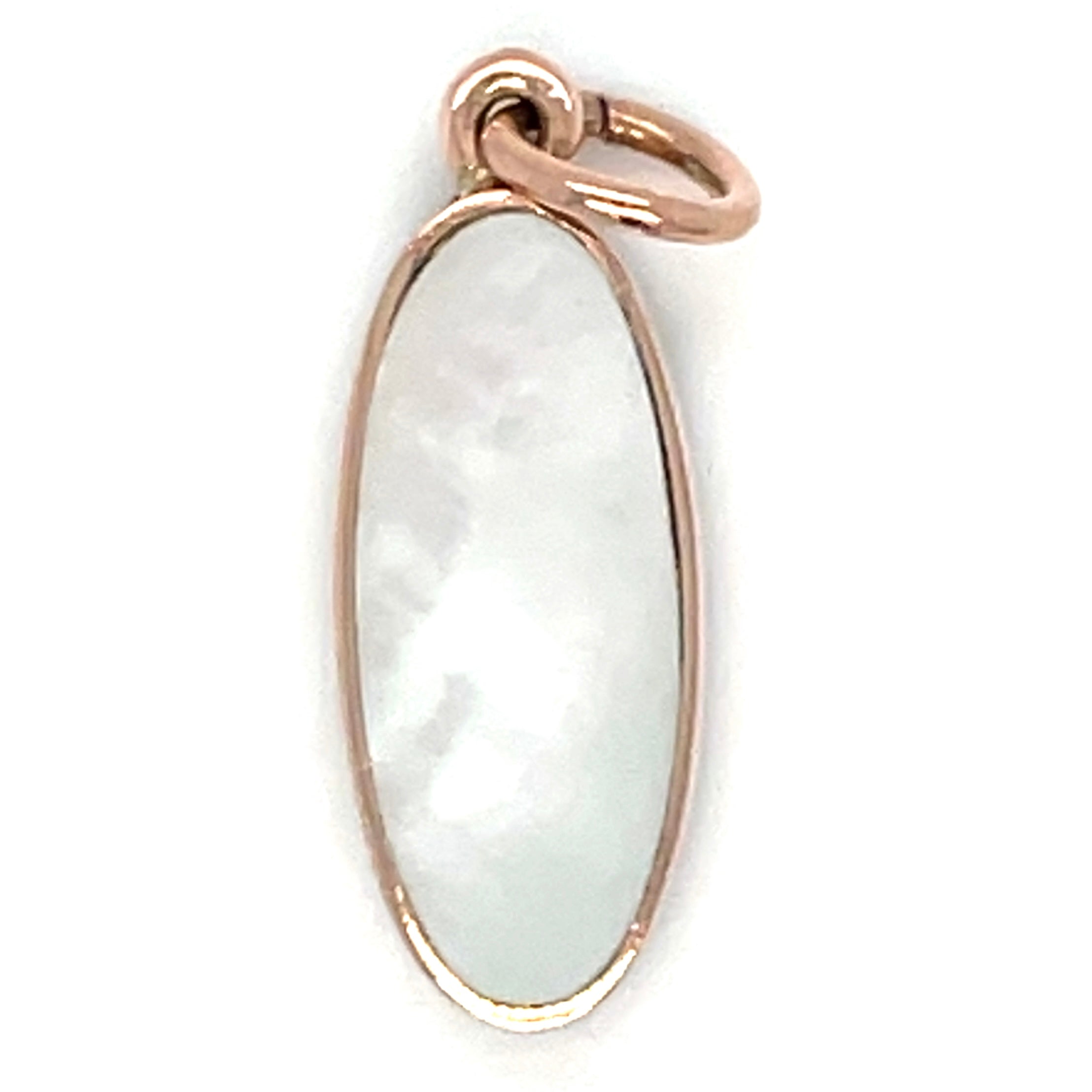 This vintage pendant features a beautiful elongated oval shape, crafted from 9ct rose gold with a stunning mother of pearl center. A classic and timeless piece to add to your jewelry collection.