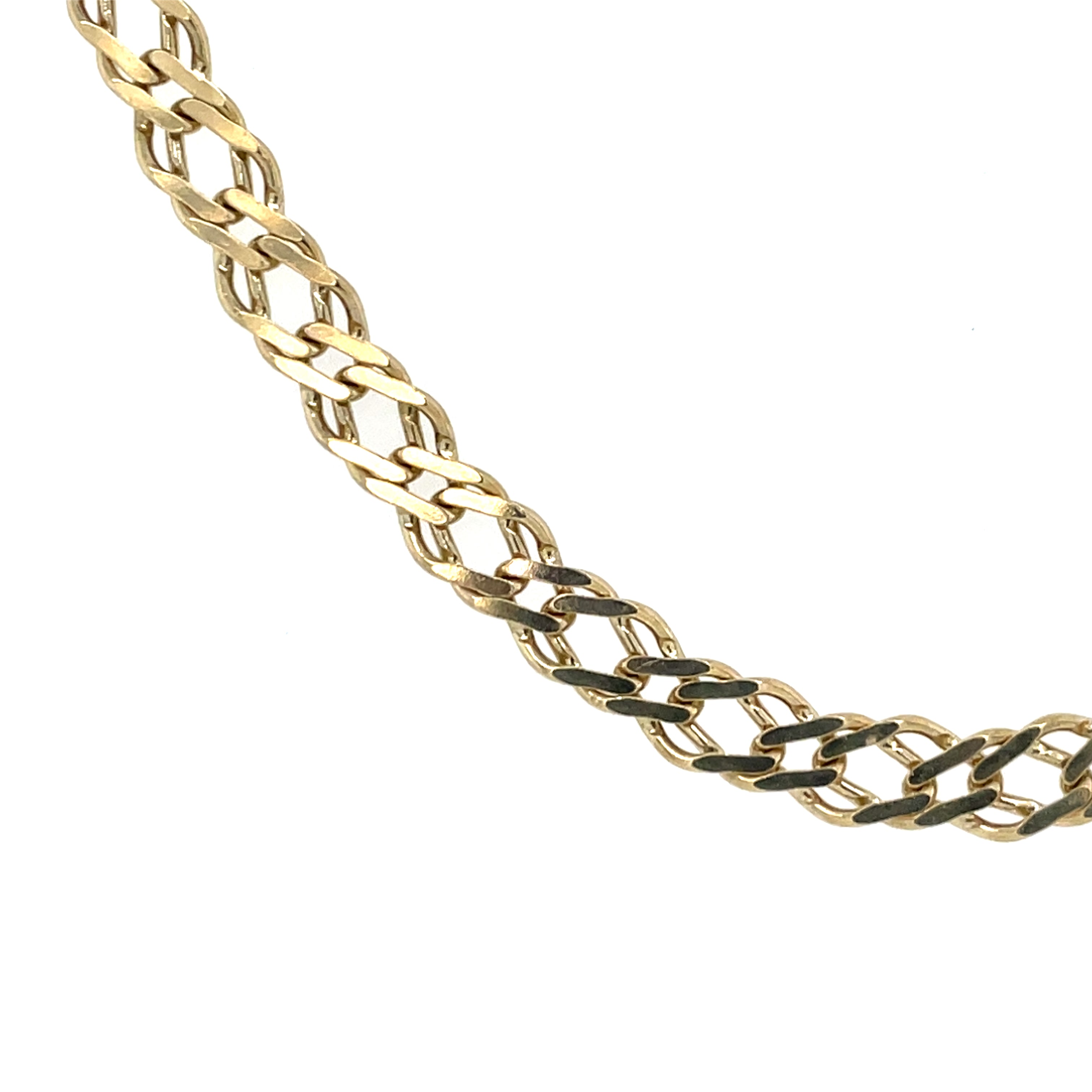 This vintage 9ct yellow gold necklace features a double curb link design and is 46cm in length. Crafted with quality and precision, this elegant piece makes a statement of timeless style and sophistication. A must-have for any vintage jewellery collector or enthusiast.