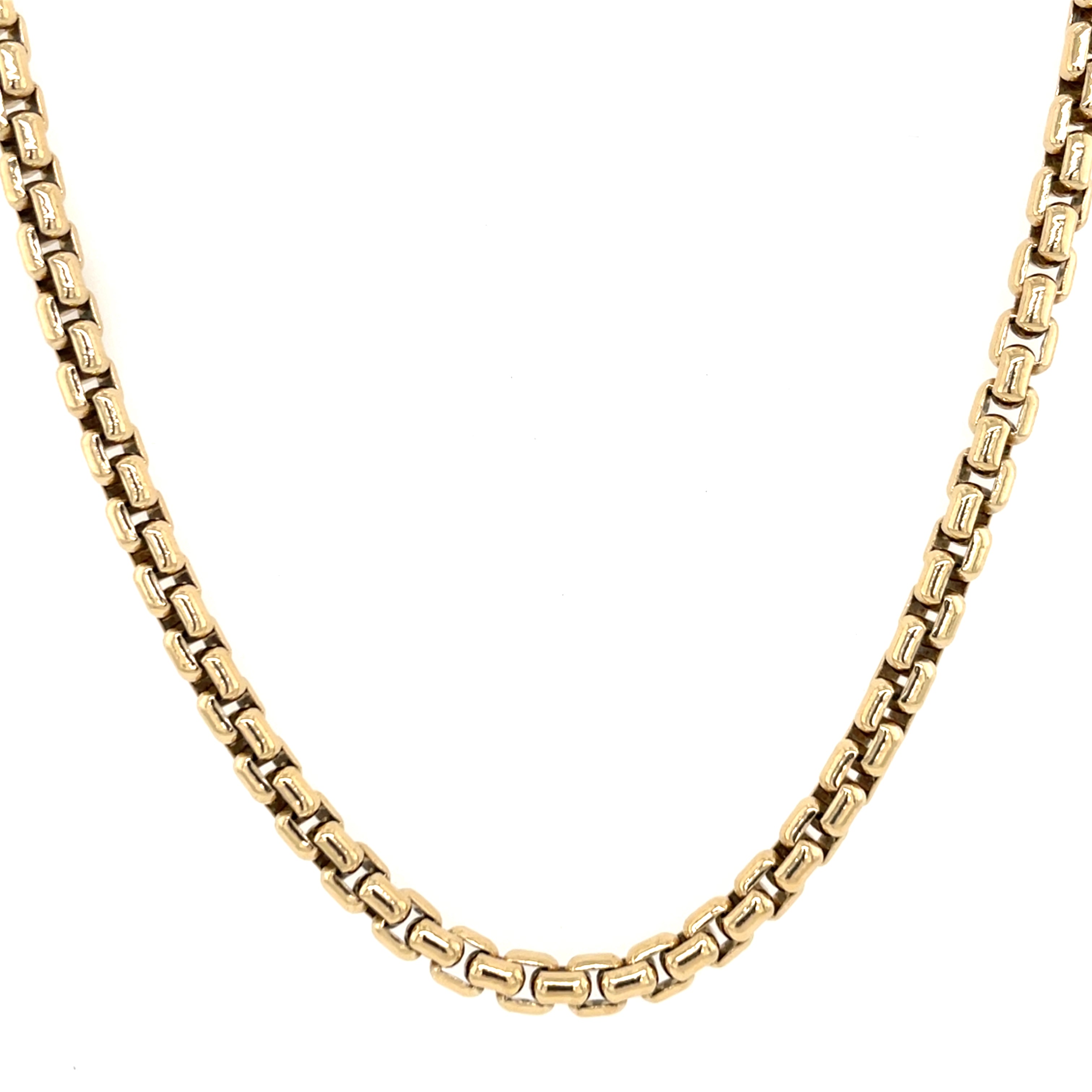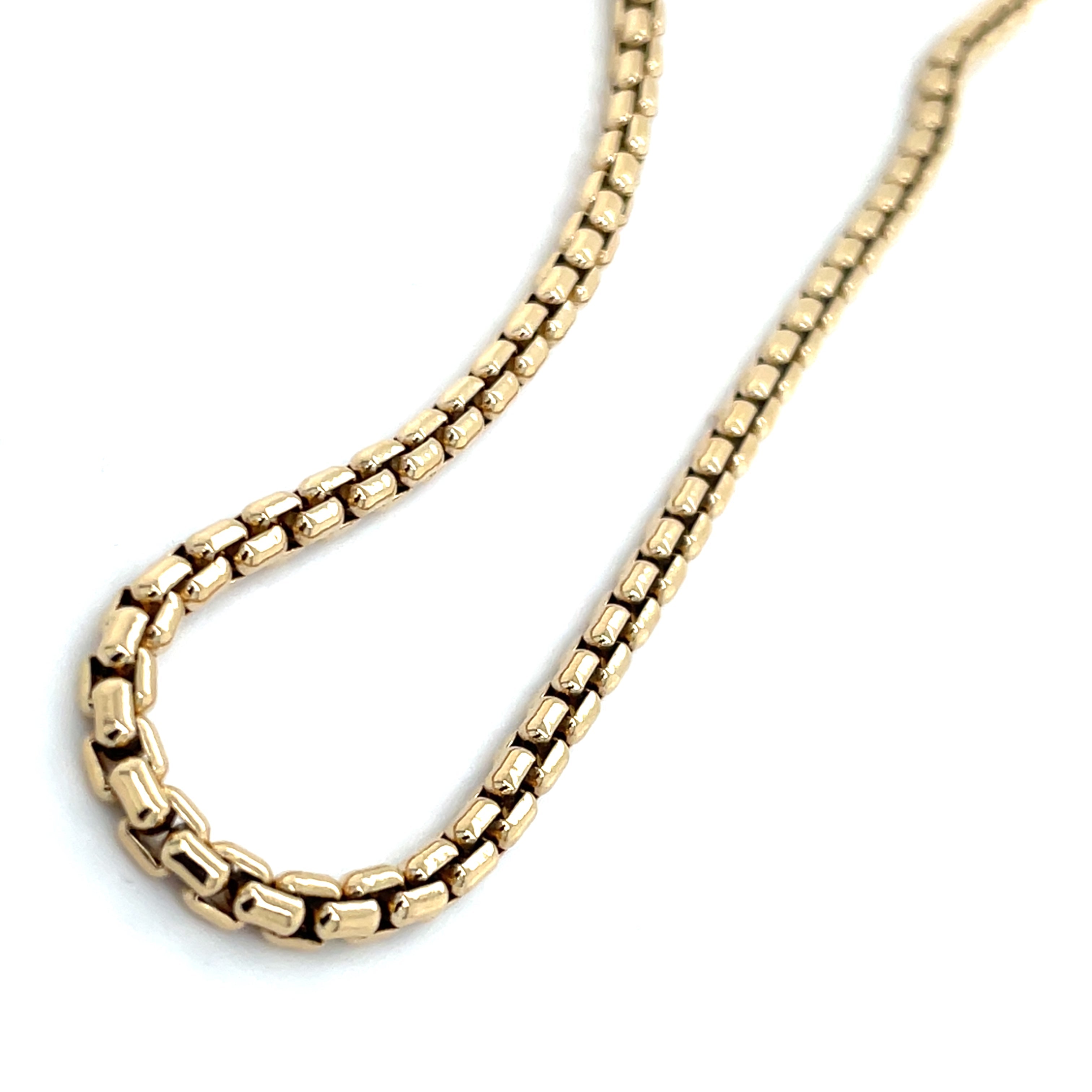 This vintage 9ct yellow gold necklace features a sturdy box chain design composed of heavy, solid gold links. Measuring 46cm (18 inches) in length, it combines strength and elegance. The secure catch ensures safe wear, making this piece a refined choice for those who value classic craftsmanship and lasting quality in fine gold jewellery.