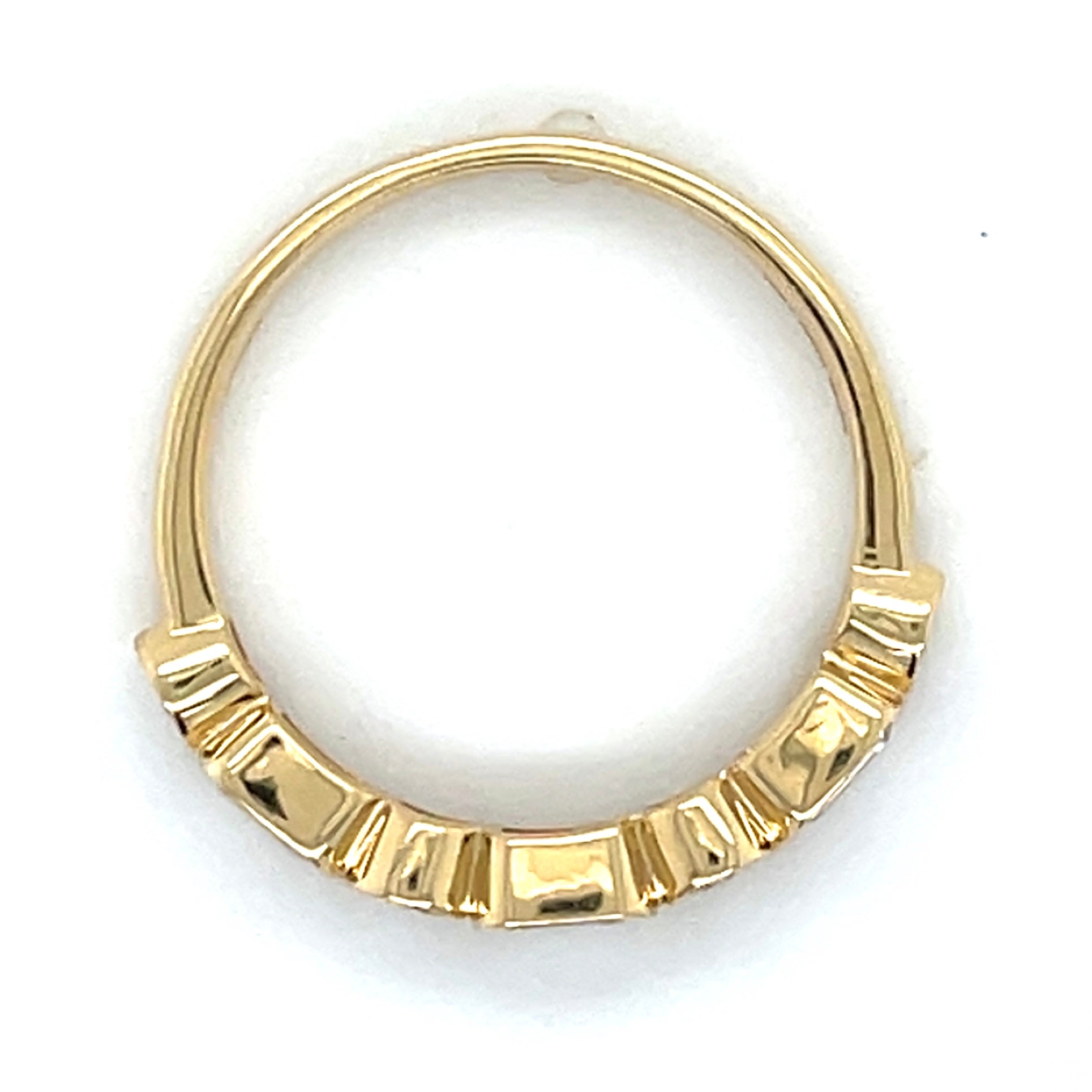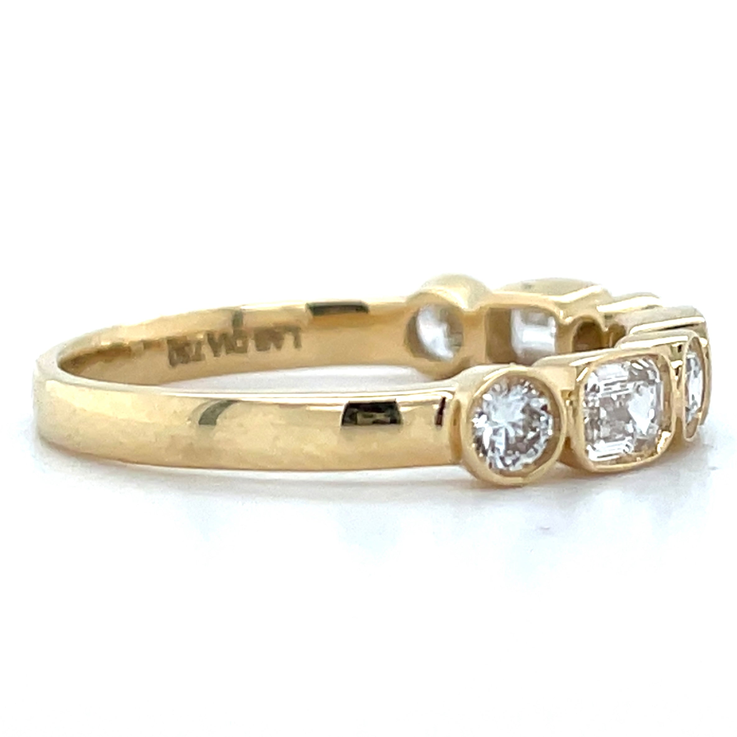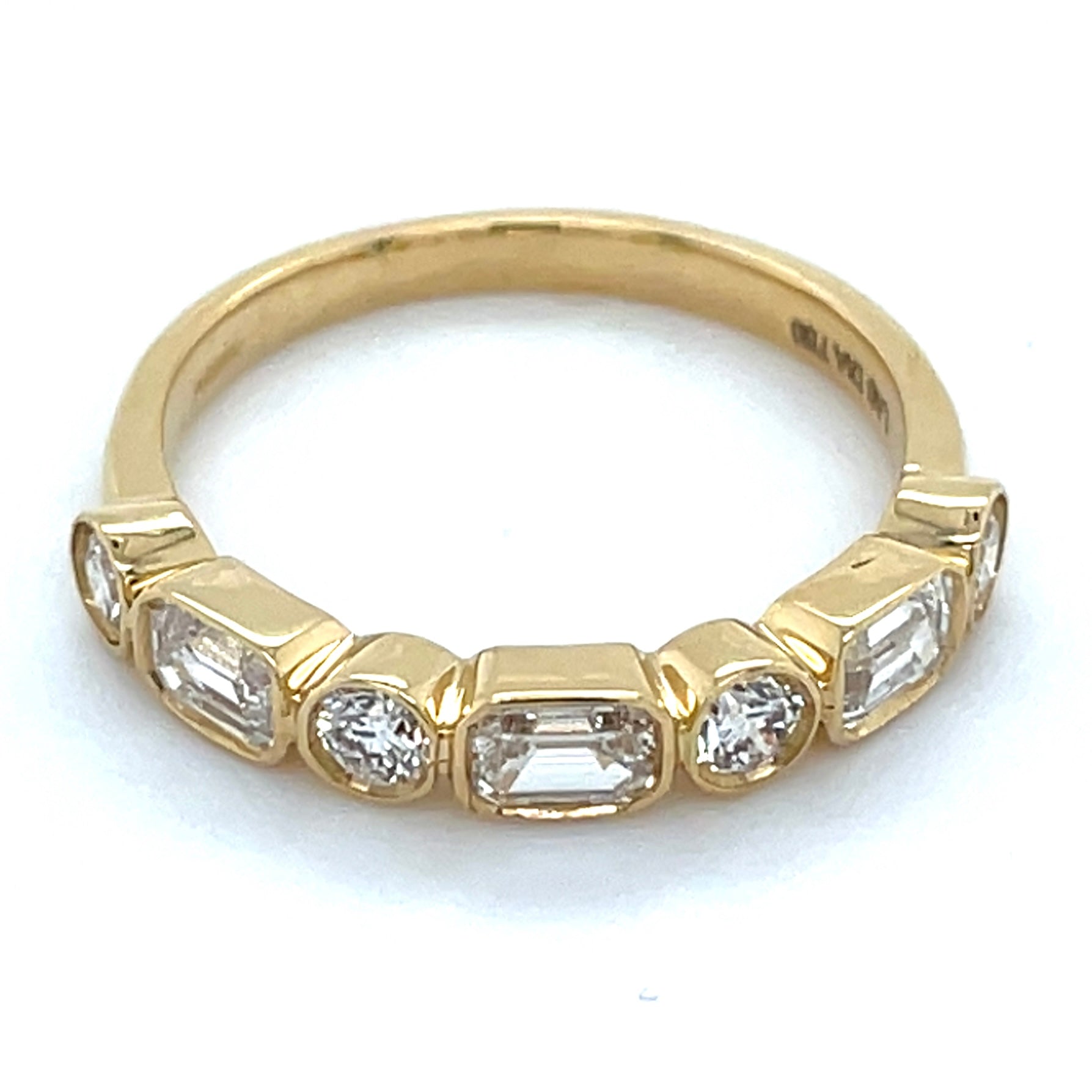 Crafted in 18ct yellow gold, this elegant ring features a stunning alternating pattern of laboratory-grown emeralds and round-cut diamonds, all bezel-set along the band for a secure, sophisticated finish. With 0.95ct total weight and VS clarity diamonds, it's a timeless piece that combines vibrant yellow gold colour with brilliant sparkle.