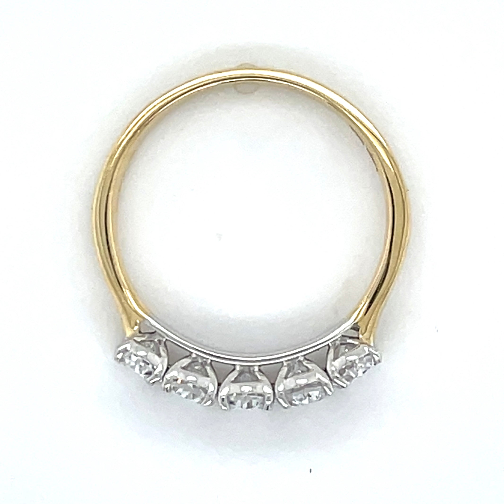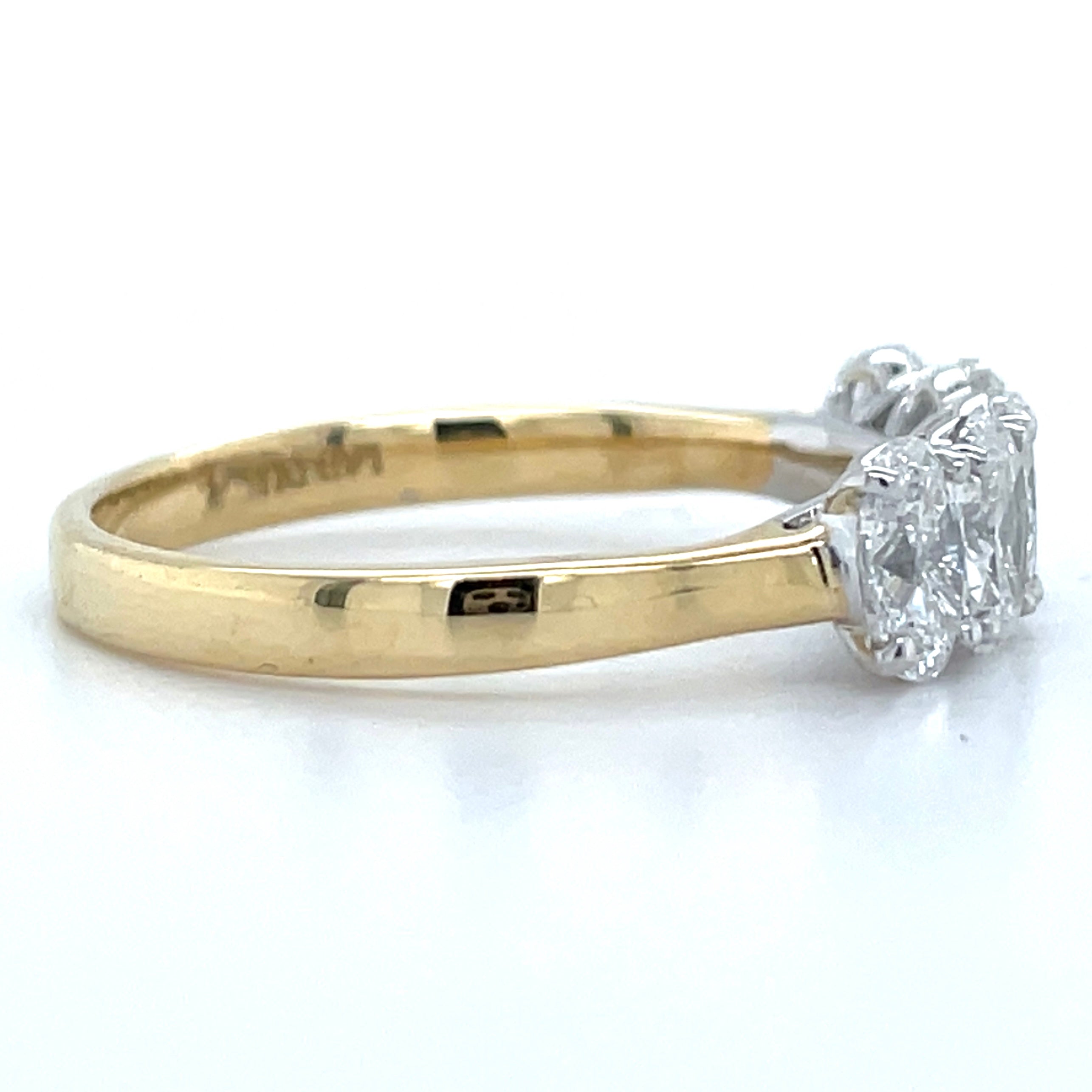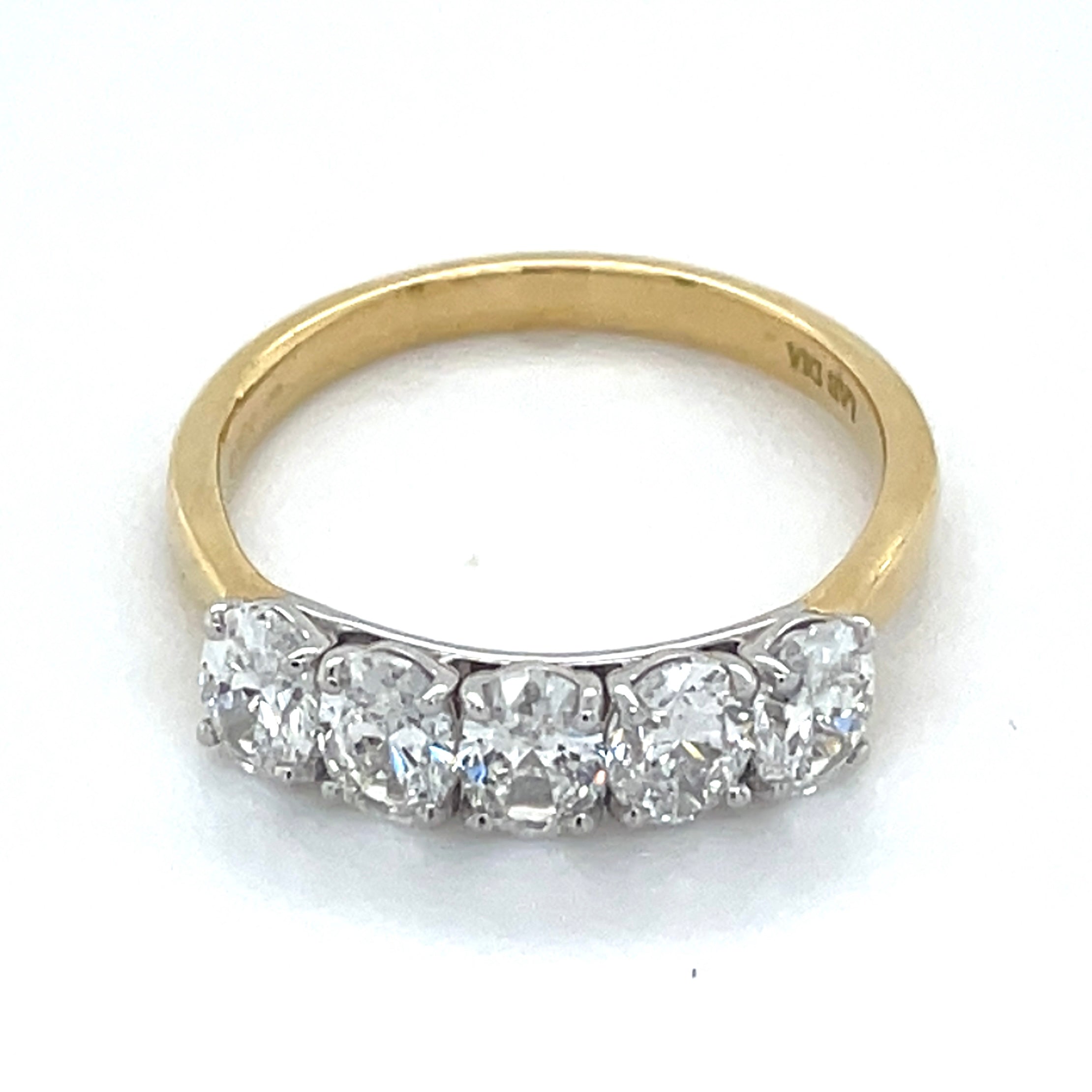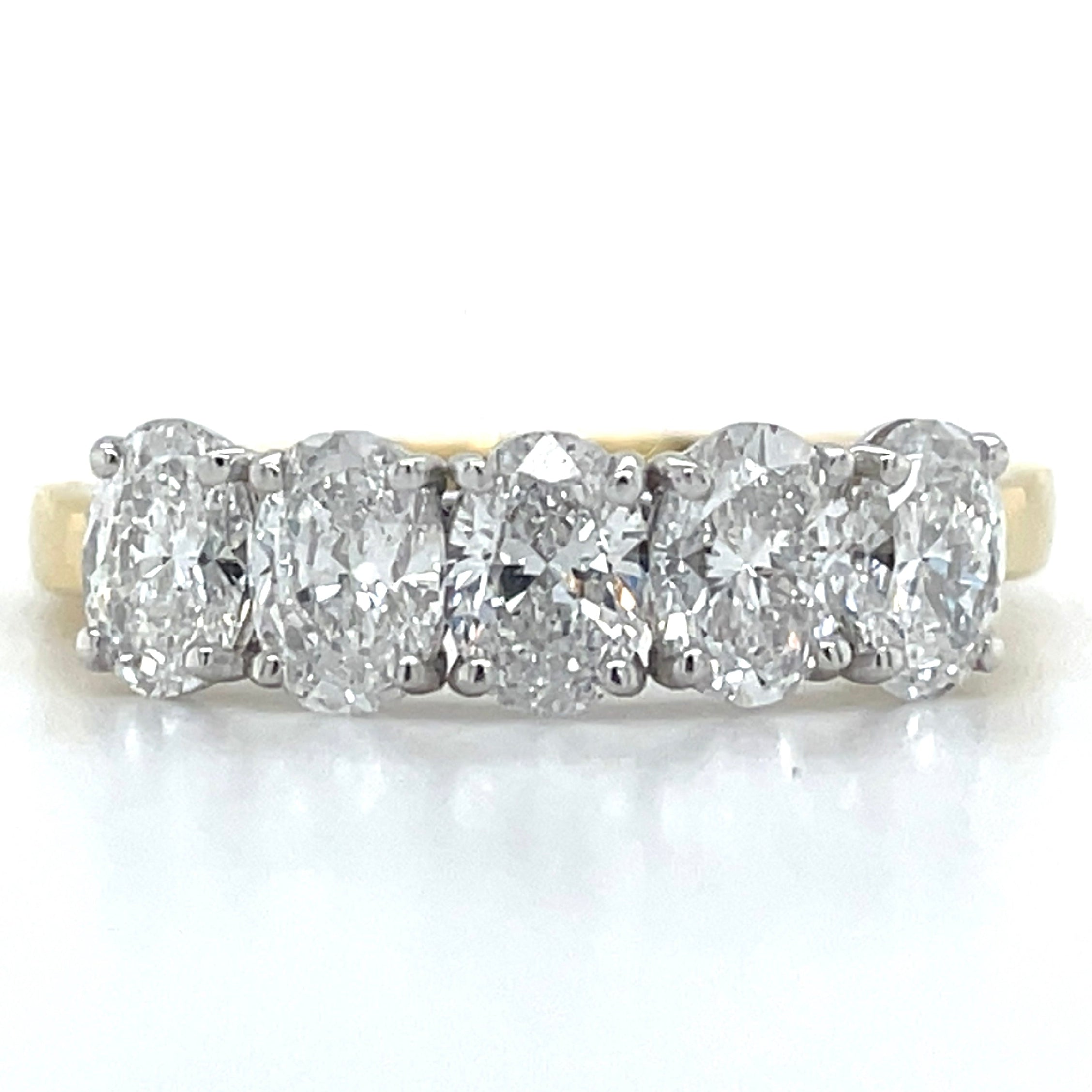 Featuring 1.53 carats of laboratory grown diamonds in VS clarity, this elegant five stone ring showcases an oval centrepiece secured by platinum claws. The warm lustre of the 18ct yellow gold band provides a classic foundation for this sophisticated piece.