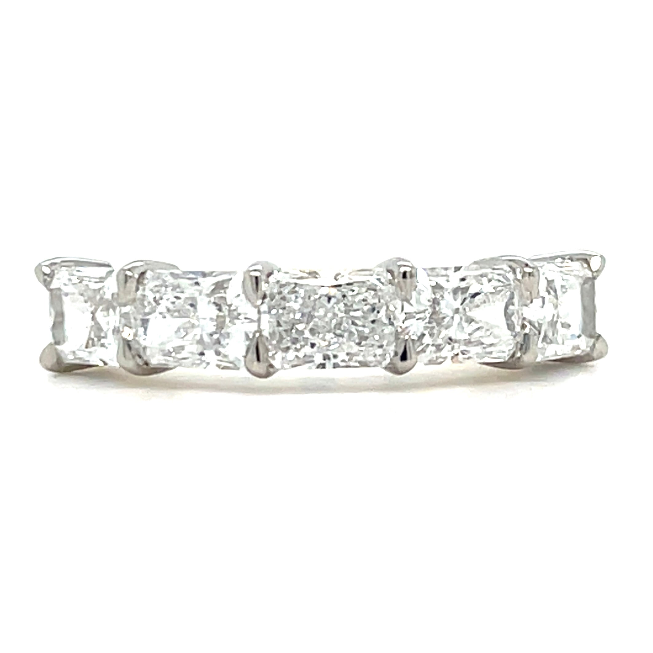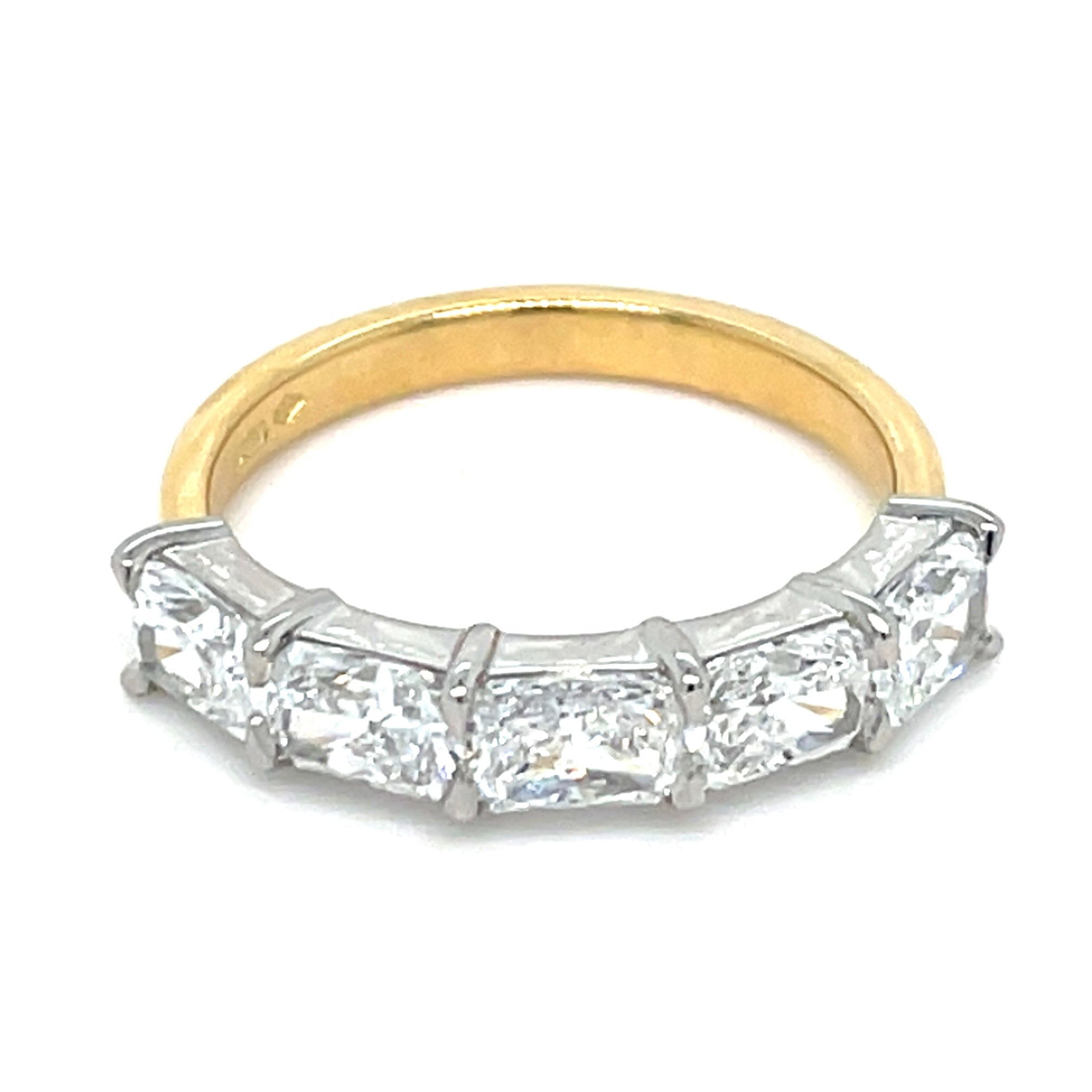 The 18ct Yellow Gold and Platinum Head 1.87ct Lab Grown Five Stone Radiant Cut Eternity Ring features a durable platinum head, ensuring stability and security for the radiant cut stones. This combination of materials not only enhances the ring's aesthetic appeal but also contributes to its long-lasting quality and resistance to wear.This ring is IGI certified with the following