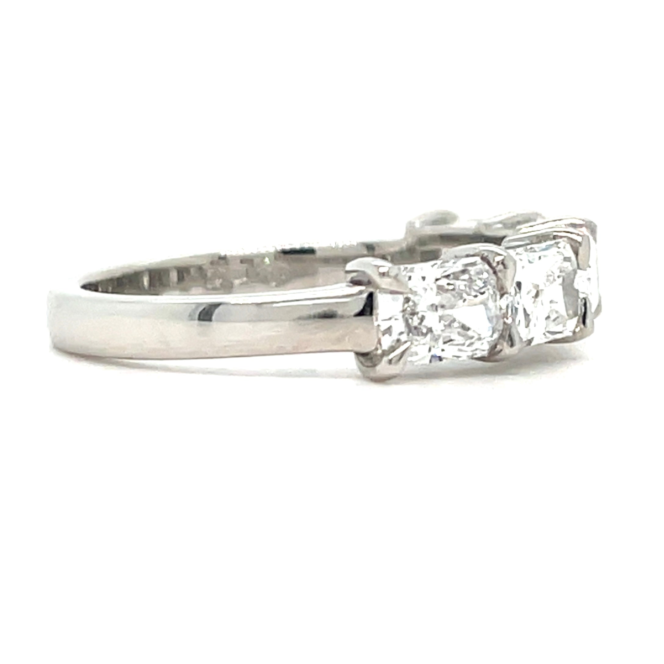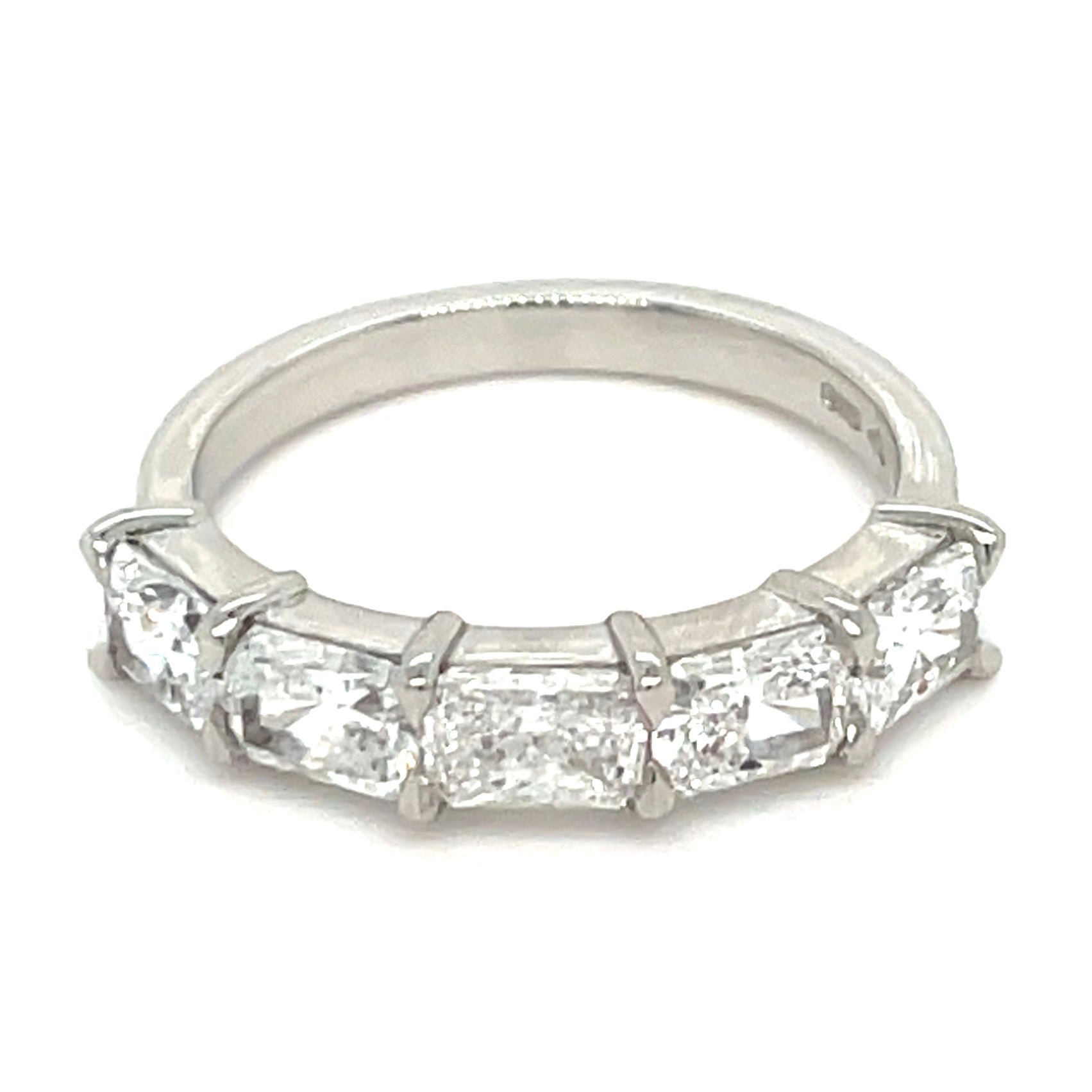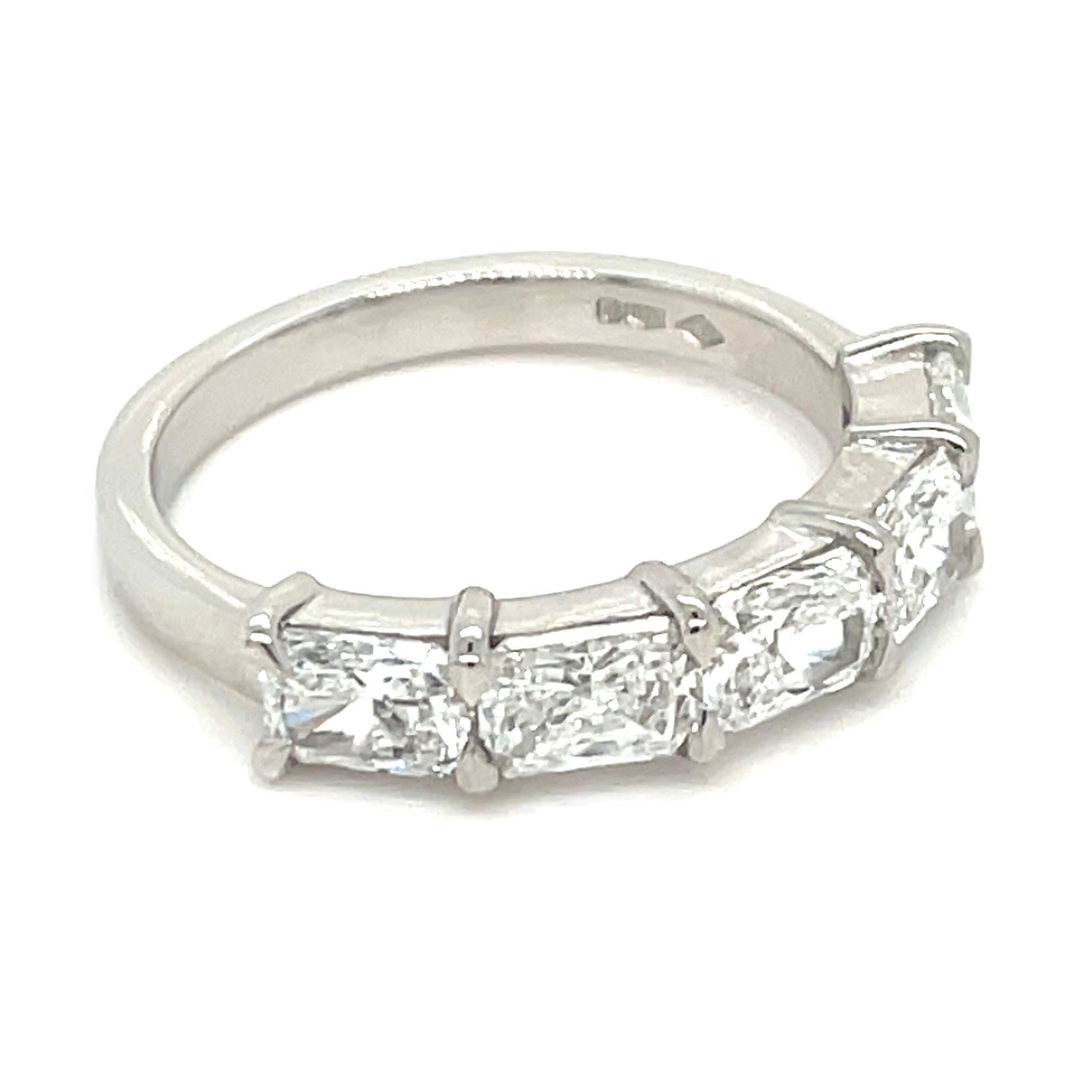 Introducing the Platinum 1.81ct Lab Grown Five Stone Radiant Cut Eternity Ring, featuring five radiant-cut stones totaling 1.81 carats. This expertly crafted ring offers a timeless design, showcasing the brilliance of lab-grown diamonds, providing durability and aesthetic appeal suitable for any occasion. This ring is IGI certified with the following