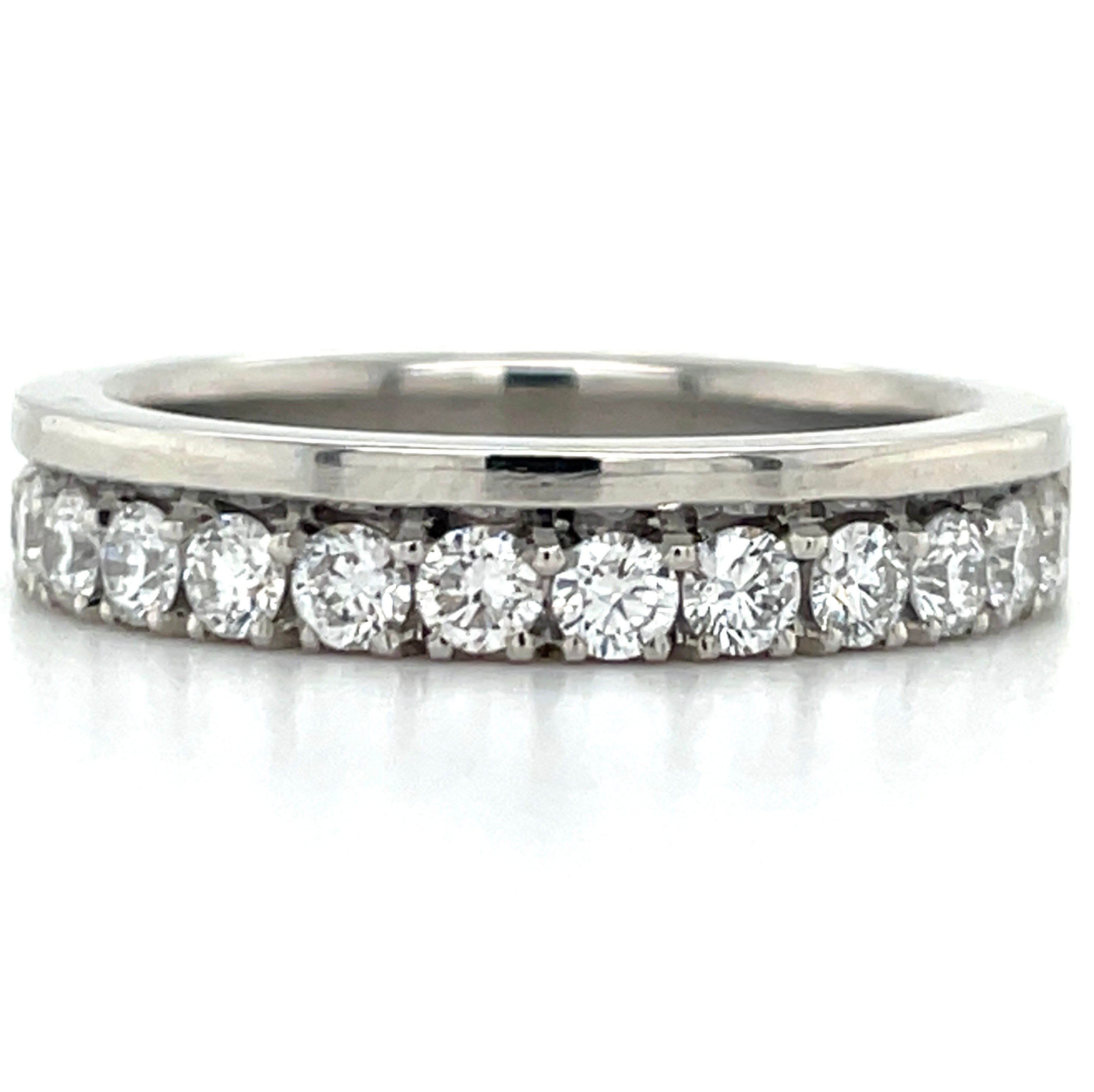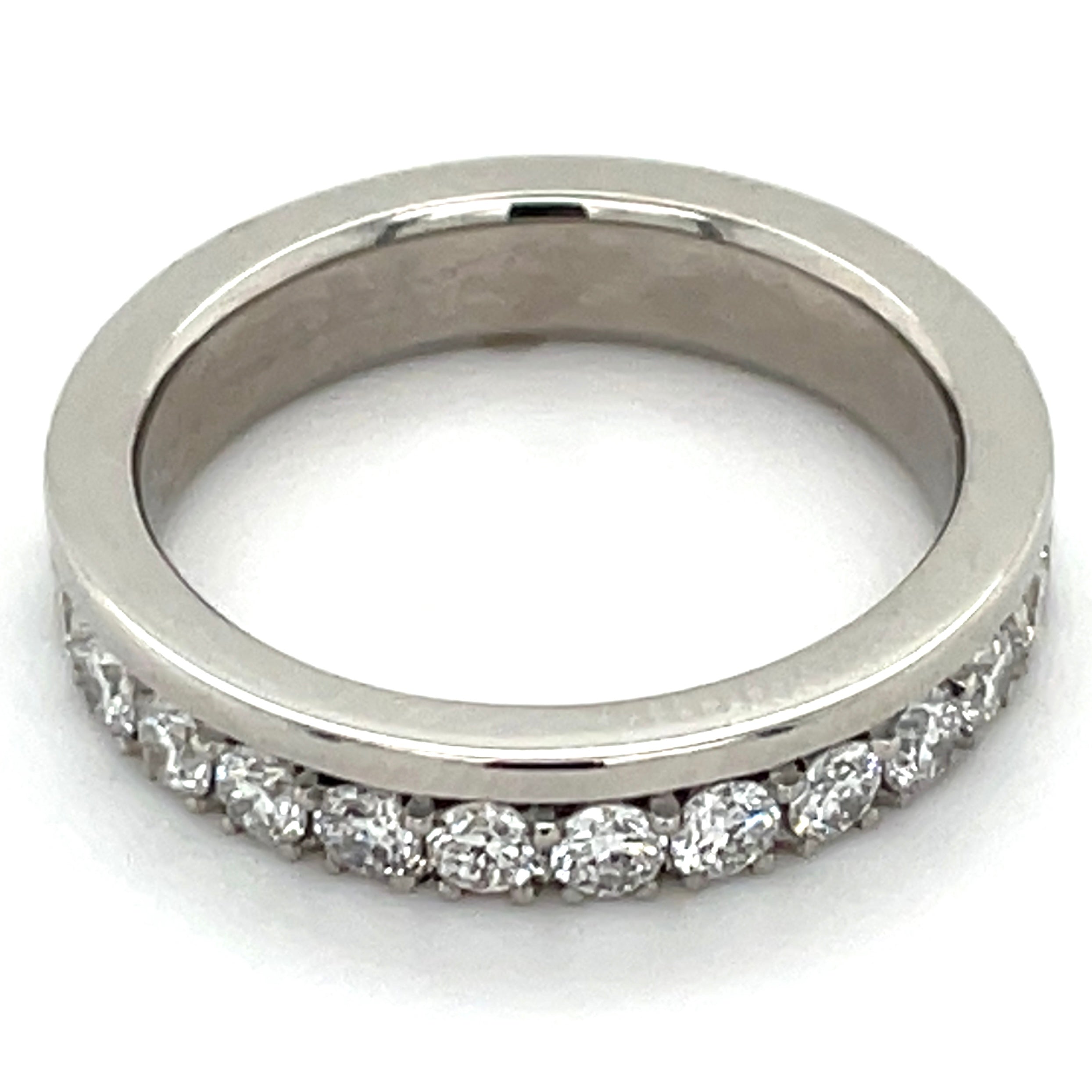 This platinum band features a unique offset castle setting, showcasing thirteen laboratory-grown diamonds with a total weight of 0.80ct. Measuring 4mm in width, the band is elegantly accented by 2.5mm diamonds, offering a refined balance of sparkle and craftsmanship for a sophisticated finish. The diamonds are D Colour and Vvs2 Clarity.