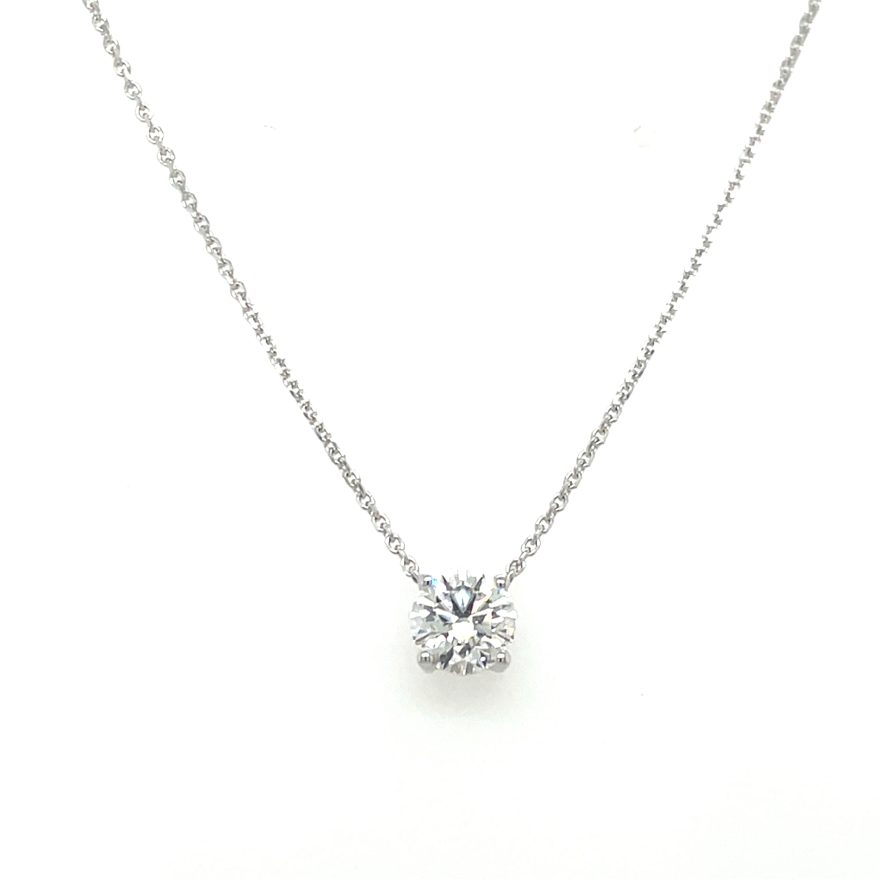 This 14ct White Gold pendant features a stunning 1.01ct- 1.05ct round brilliant floating diamond on an 18” chain with jump rings at 16” and 17” for a shorter length, grown in a laboratory for exceptional clarity and brilliance. The perfect blend of elegance and sustainability, this pendant is a must-have for any jewellery collection. The diamond is E colour, Vs1 clarity and ideal, Ex, Ex cut.