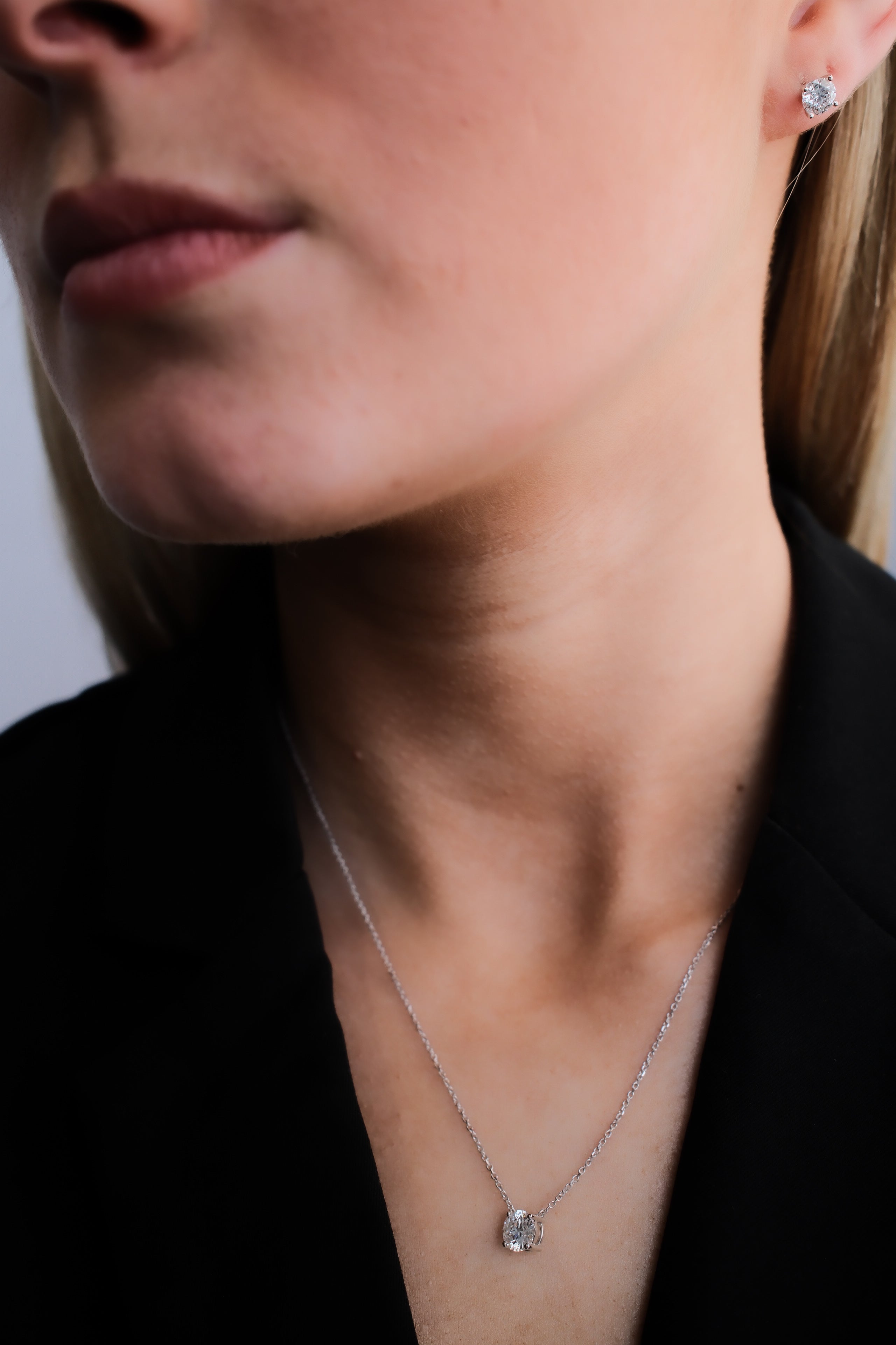 This set features a 14ct white gold pendant with a floating diamond, paired with four claw diamond earrings. Both the pendant and earrings are made with laboratory grown diamonds, totaling 1ct-1.05ct per part.