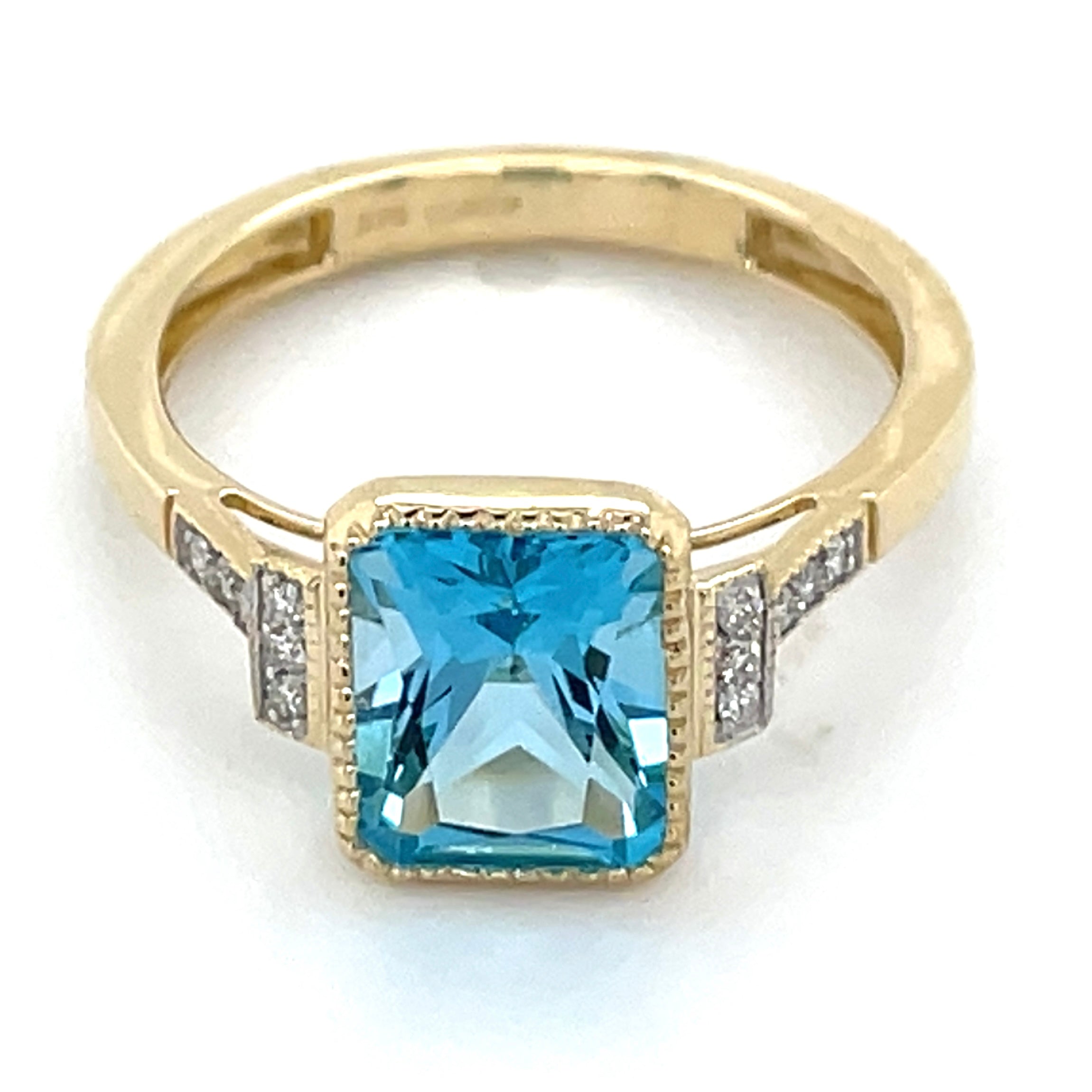 This elegant 9ct yellow gold ring features a stunning 2.47ct blue topaz stone secured in a sophisticated bezel setting with a refined milgrain border. Complemented by 0.07ct of sparkling diamonds positioned along the band, it combines timeless craftsmanship with contemporary design.